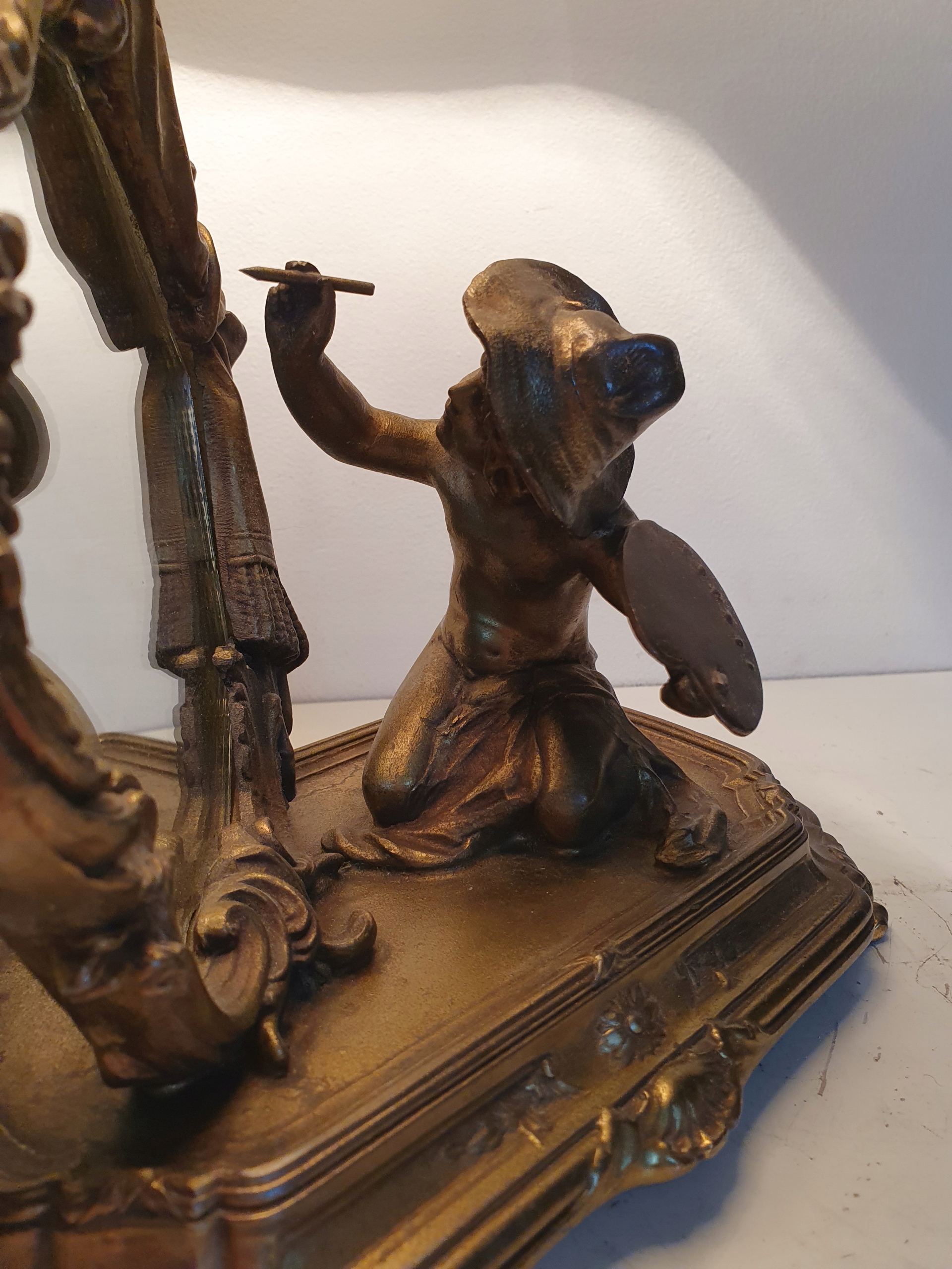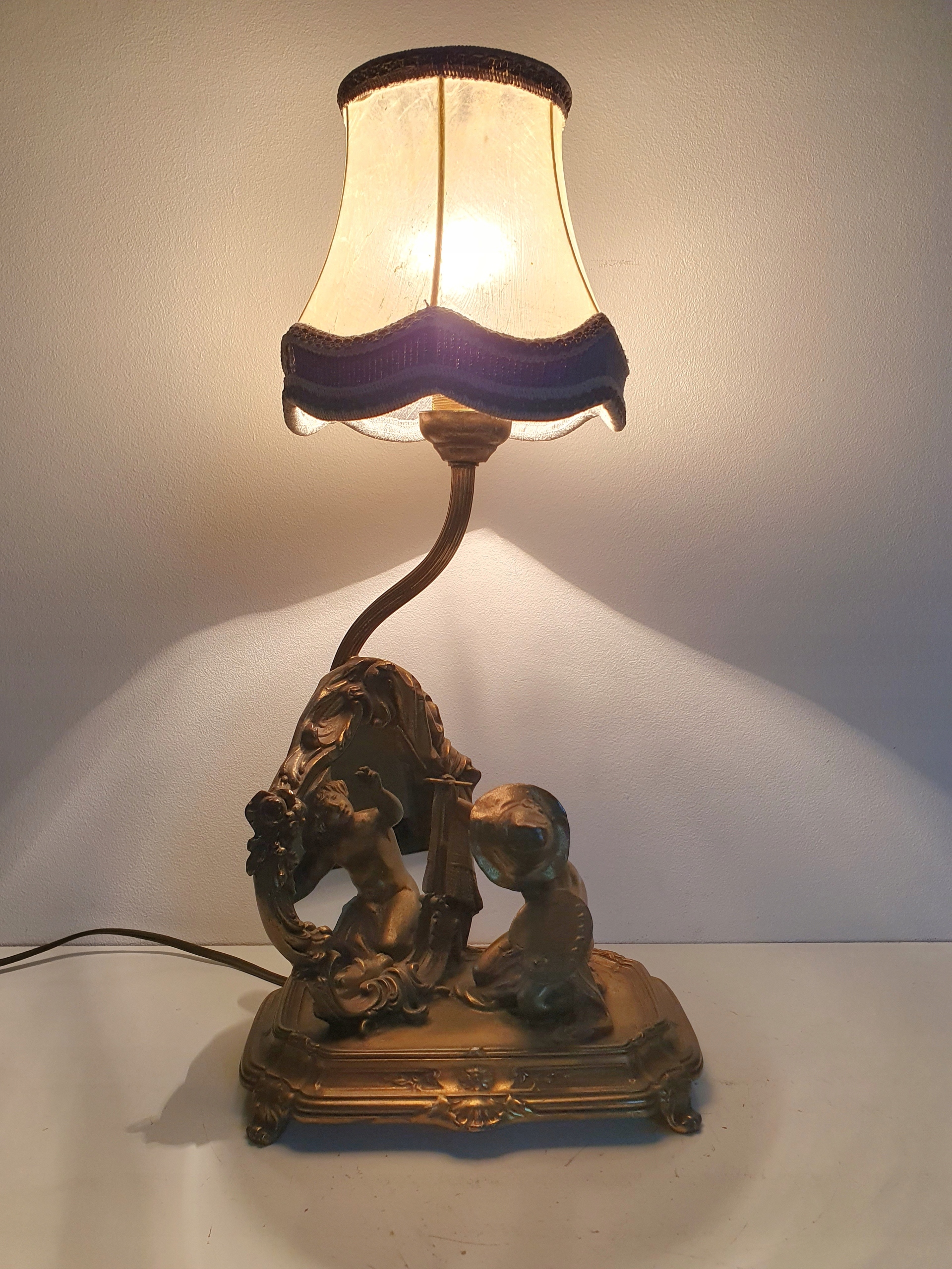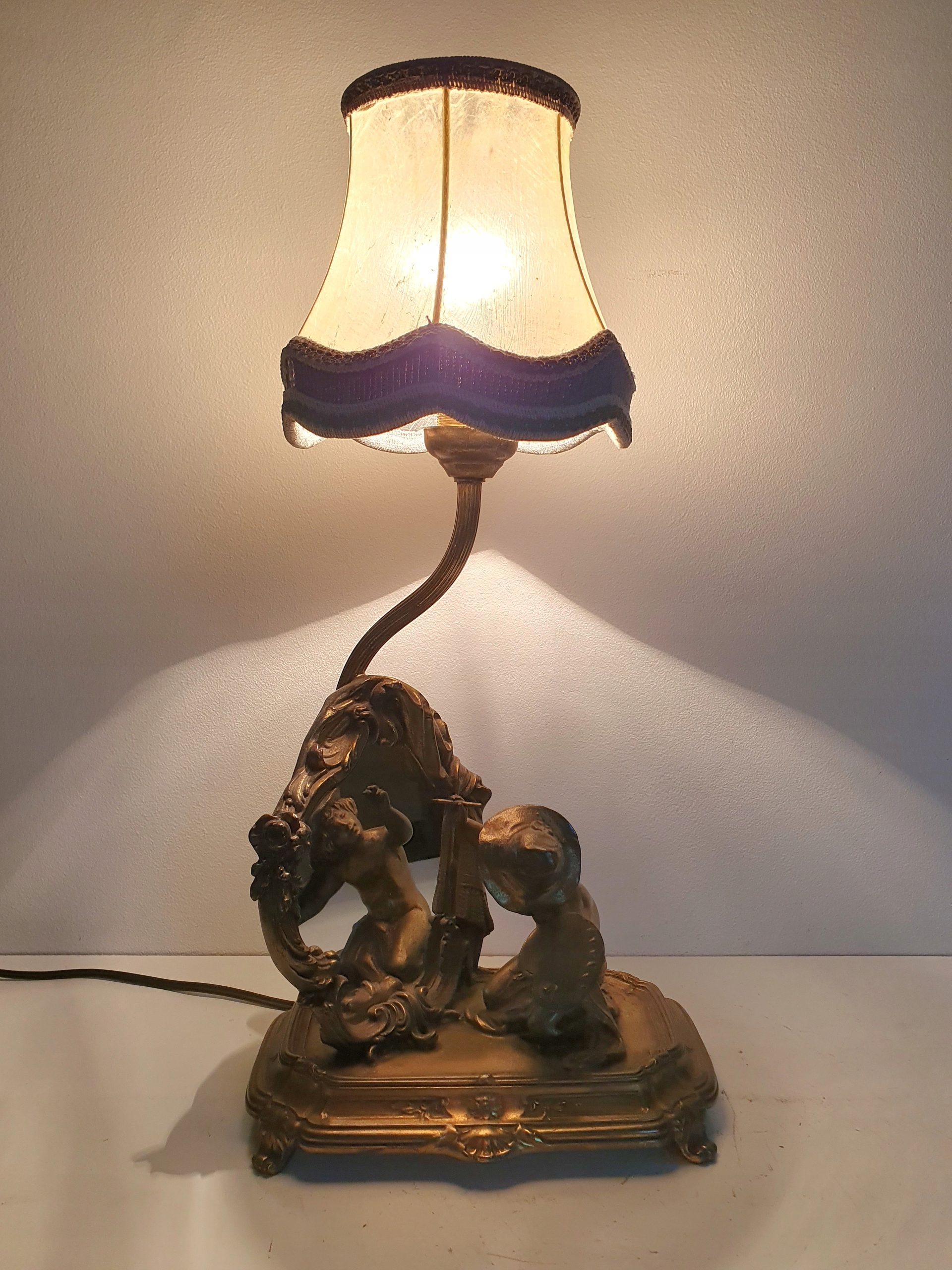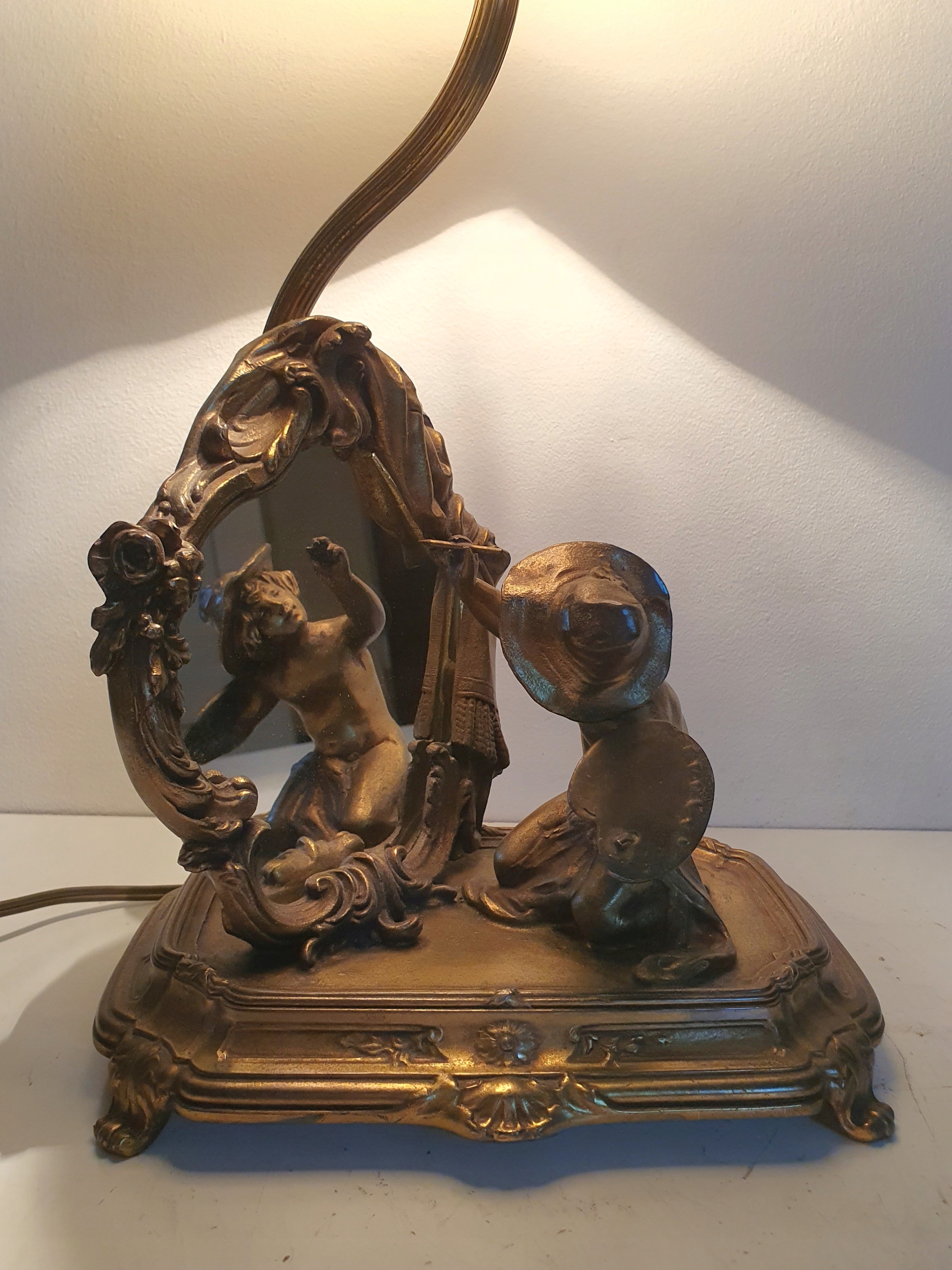 Элегантная настольная лампа примерно 1930 года, изготовленная из сочетания олова и латуни. В основании светильника изображена сцена рисования мальчика - в руке фигура держит цветовую палитру и кисть. Мальчик пишет картину, а место, которое должно было изображать его работу, заменено зеркалом, что придает всей композиции неповторимый шарм и глубину. Абажур выполнен из материала, напоминающего пергамент или тонкую кожу, украшен декоративной лентой. Все выполнено в классическом стиле с богатым декором. Высота светильника 42 см. Редкая коллекционная вещь, идеально подходящая для элегантного интерьера.