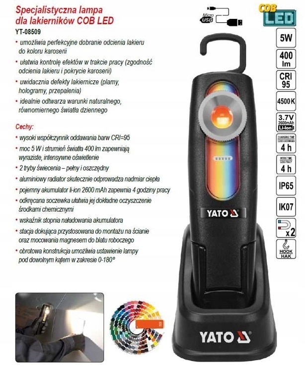 - YT-08509 — портативная лампа, идеально воспроизводящая условия естественного освещения. Современный источник COB LED с очень высоким индексом цветопередачи CRI=95, подобным солнечному свету, позволяет идеально подобрать среди прочего нужный цвет и оттенок лака. автомобильный. Это облегчает проверку цвета по образцу и проверку самого покрытия. В свете лампы YT-08509 вы легко сможете обнаружить мельчайшие дефекты краски, такие как пятна, голограммы или прогары.