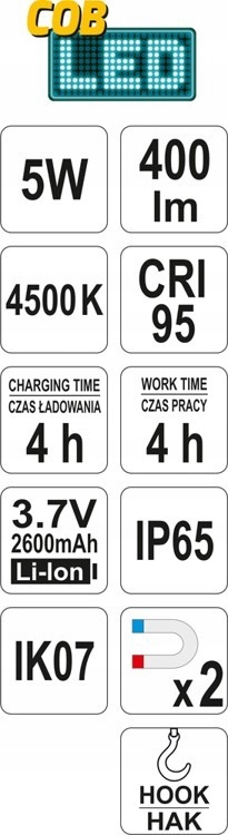 <р> - Эффективный источник COB LED также обеспечивает световой поток до 400 лм, неслыханный среди обычных аккумуляторных светильников для мастерских. Лампа работает в двух режимах освещения. Через 5 минут автоматически меняет режим освещения со 100% на 50%, предотвращая более быстрый разряд аккумулятора. Высокая мощность источника COB LED мощностью 5 Вт требует соответствующего отвода избыточного тепла, что было достигнуто за счет использования специального алюминиевого радиатора. <р> - Отвинчивающаяся линза обеспечивает тщательную очистку <р> - Емкий литий-ионный аккумулятор емкостью 2600 мАч обеспечивает 4 часа непрерывной работы. Для полной зарядки аккумулятору требуется 4 часа. Фонарь имеет индикатор заряда аккумулятора. <р> - Поворотный корпус позволяет наклонять лампу под любым углом. Благодаря этой функции, а также двум магнитам и вращающемуся крючку его можно легко и гибко прикрепить. Это позволяет оптимально осветить нужное пространство, оставив руки свободными. <р> - Светильник имеет усиленную конструкцию, что обеспечивает всему светильнику высокий класс механической прочности IK07. <р> - Светильник имеет высокий класс герметичности IP65. <р> - В комплект поставки лампы входит док-станция с универсальным зарядным разъемом µUSB. Станция предназначена для установки на стену и крепления к столешнице с помощью магнита. Съемный USB-кабель позволяет заряжать док-станцию от компьютера, блока питания или других устройств с USB-портом. <р> - Малые габариты светильника позволяют его легко транспортировать во время визита к клиенту.Цель/использование