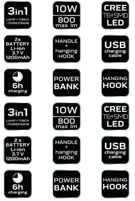 Neo Battery Camping Lamp - это продукт 3 в 1 - лампа, фонарик и банк питания. Он имеет 4 функции освещения: фонарик, боковой свет, красный боковой свет и красный свет. Лампа оснащена светодиодной Cree T6 и SMD светодиодом с легким потоком из 800 люмен и мощностью 10 Вт. Фонарик питается от литий-ионной батареи 3,7 В с объемом 1200 мАч.