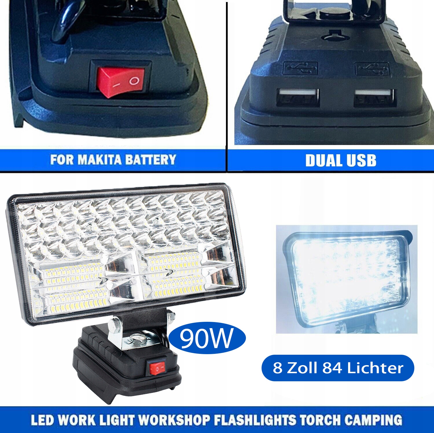 ЛАМПА ДЛЯ MAKITA 18V галогенна РОБОЧА ЛАМПА ФОХАР + 2X USB 8 ДЮЙМОВ 84 LED 90W