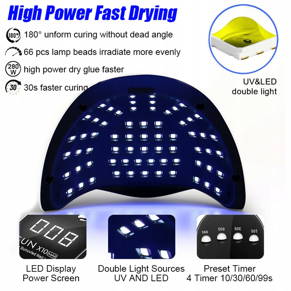 Высокоскоростная сушка в течение 10 секунд: высококачественные светодиодные шарики с оптимальным распределением шариков лампы. На рынке представлено больше ламповых бусин - 66 ламповых бусин, благодаря высокой мощности они могут отверждать гели в два раза быстрее.