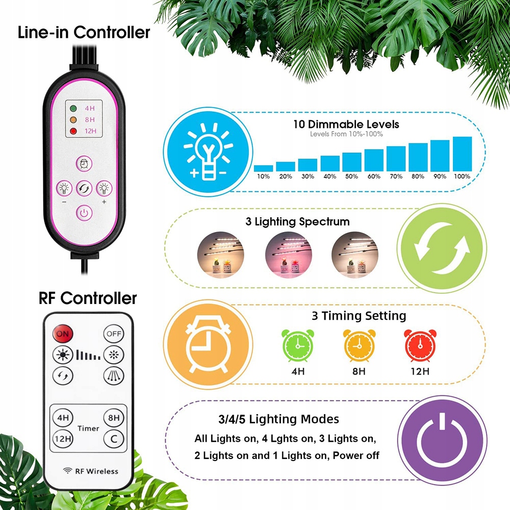 *Автоматический таймер включения/выключения: эти светодиодные светильники для растений имеет три режима работы времени: 4/8/12 часов, вы можете установить его один раз, и он будет автоматически включаться и выключаться каждый день.