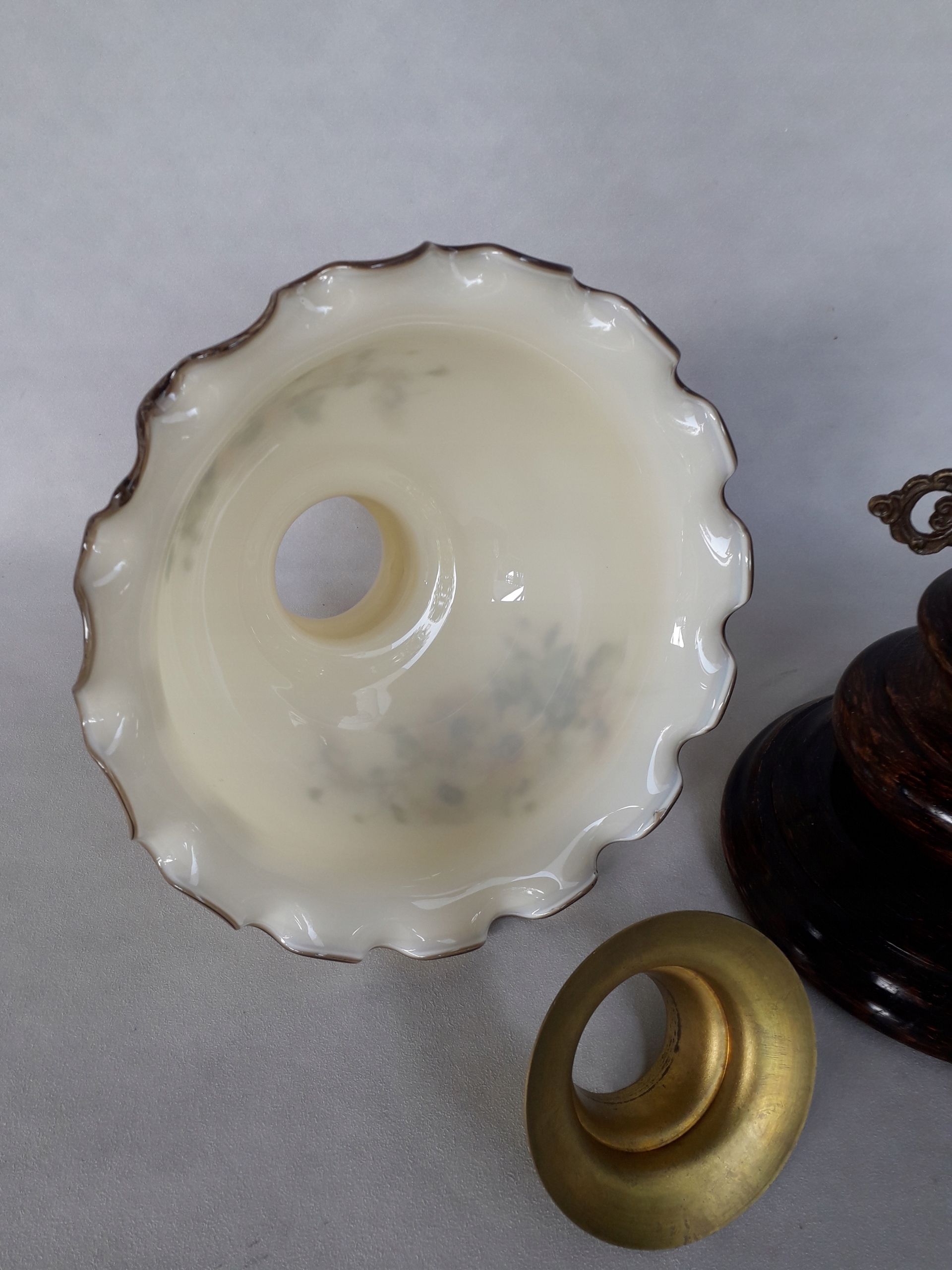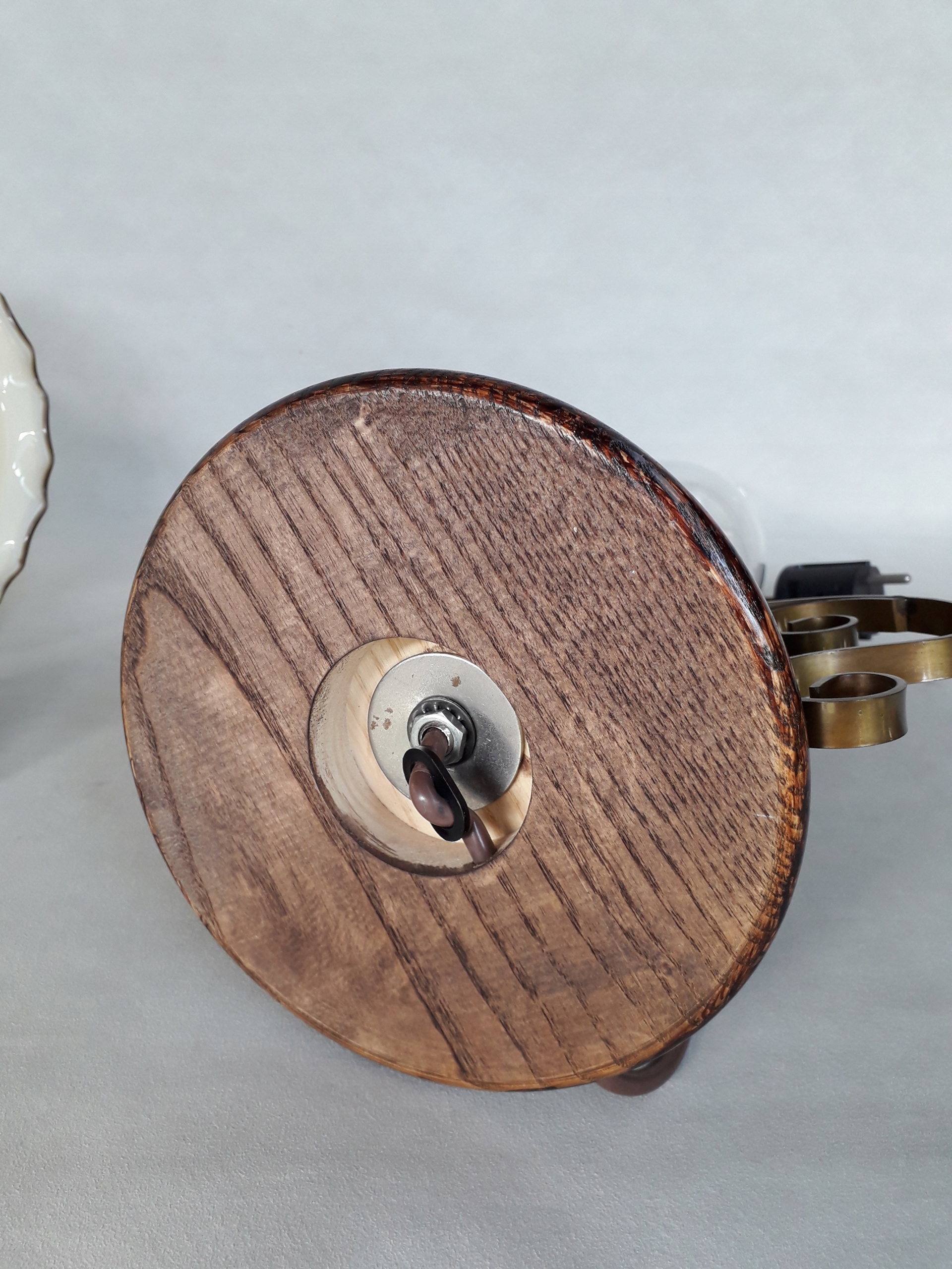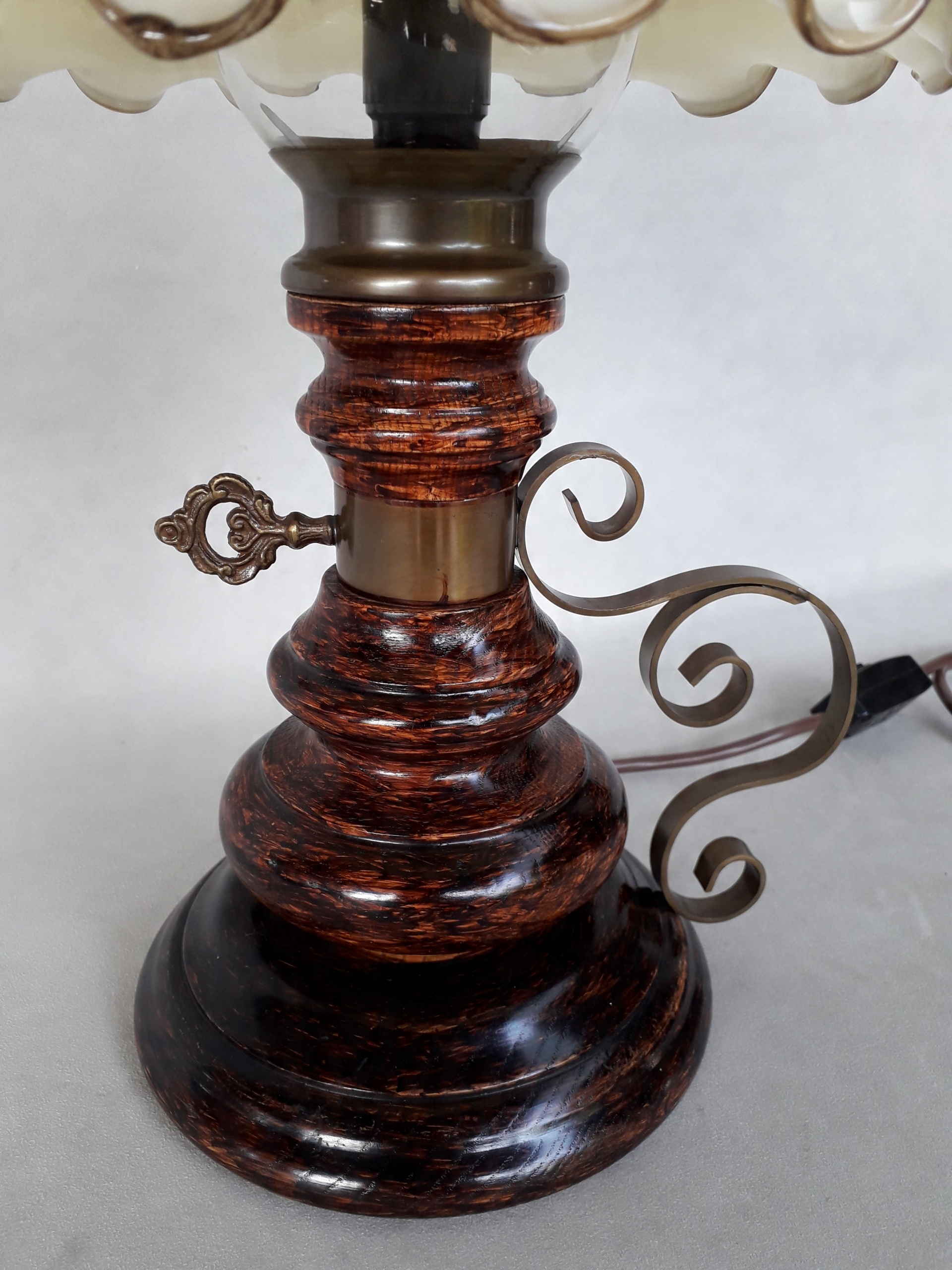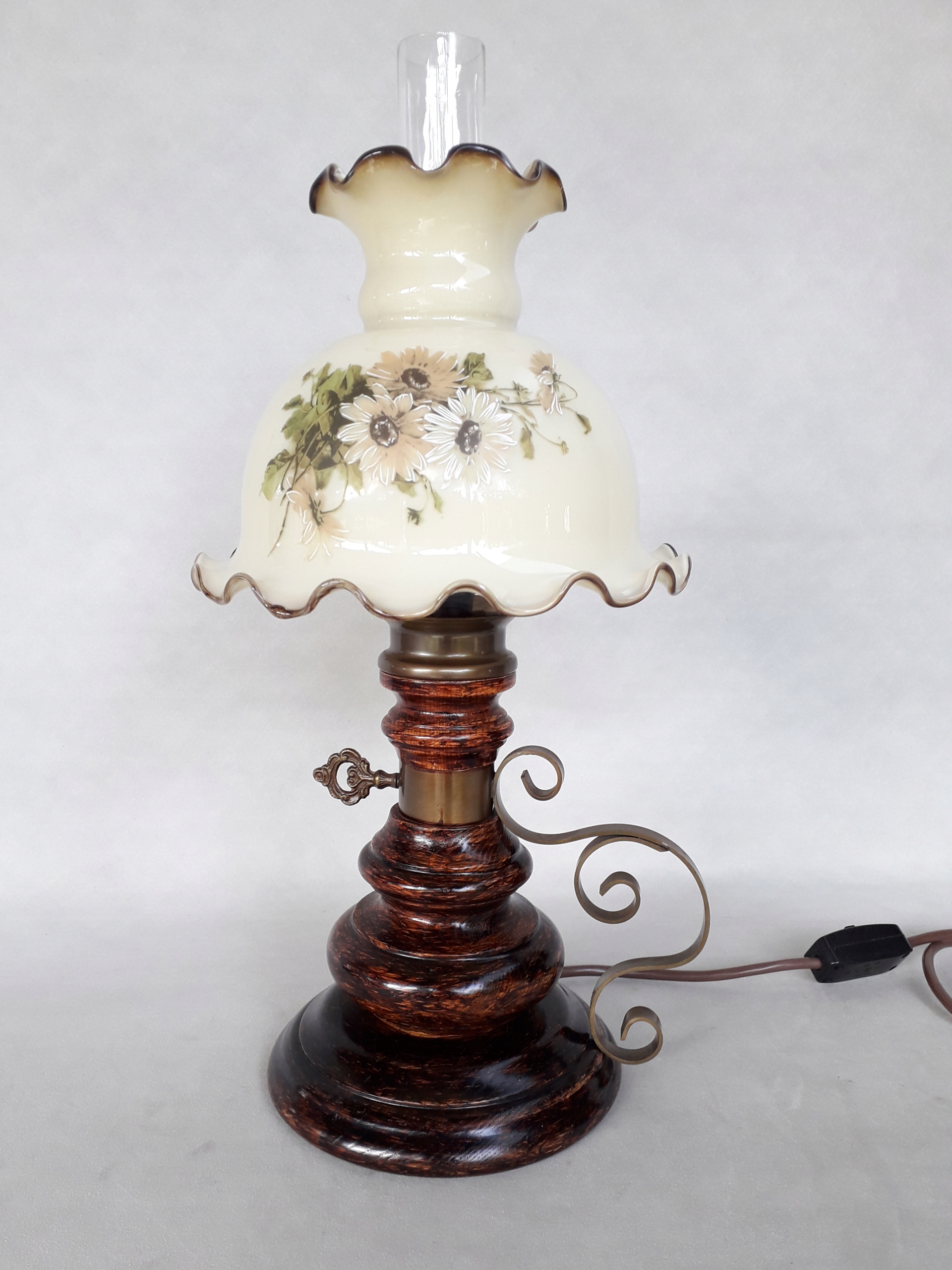 Изготовление - основание и корпус из дерева. Верхняя часть украшена стеклянным цилиндром и красивым стеклянным плафоном.