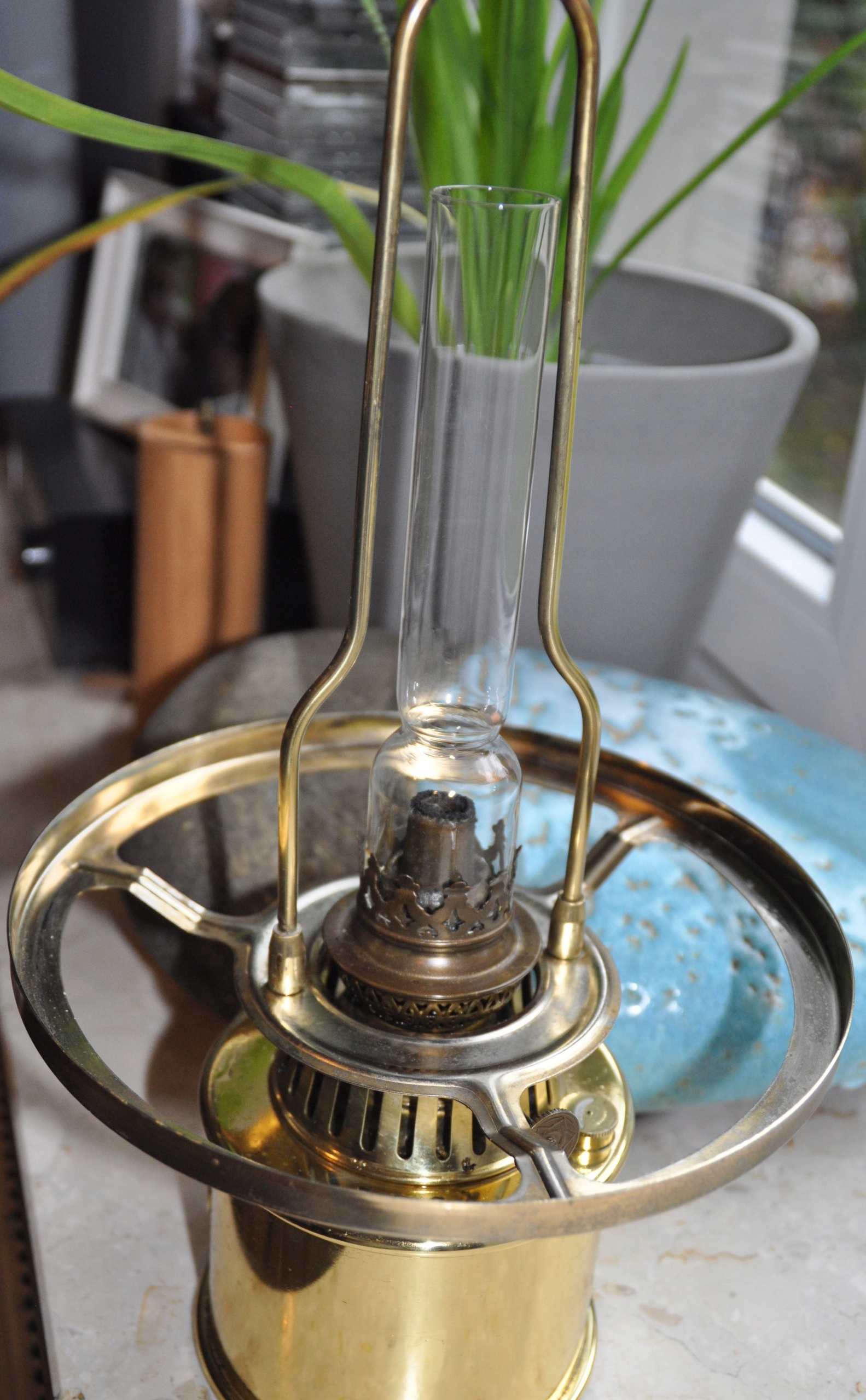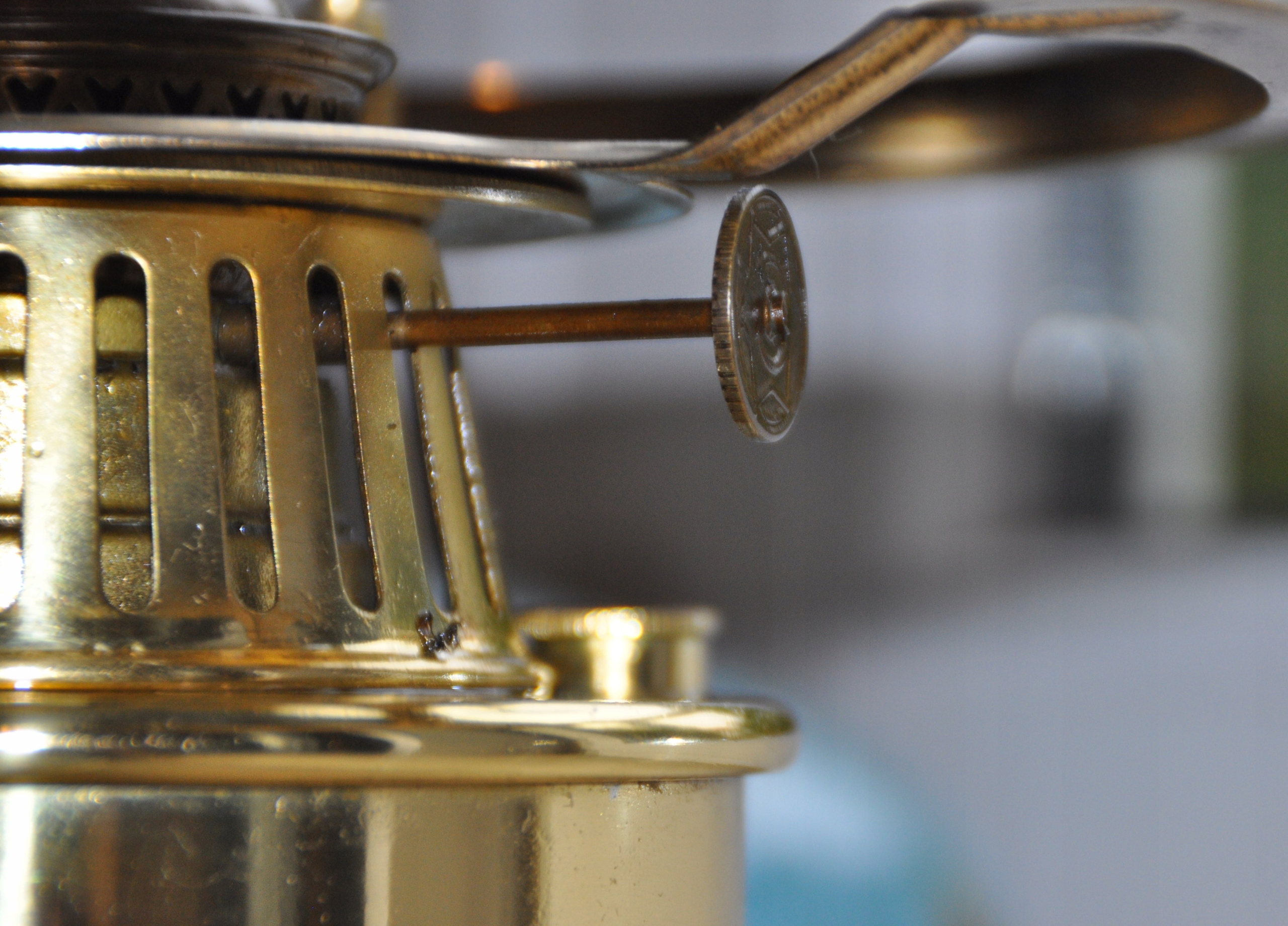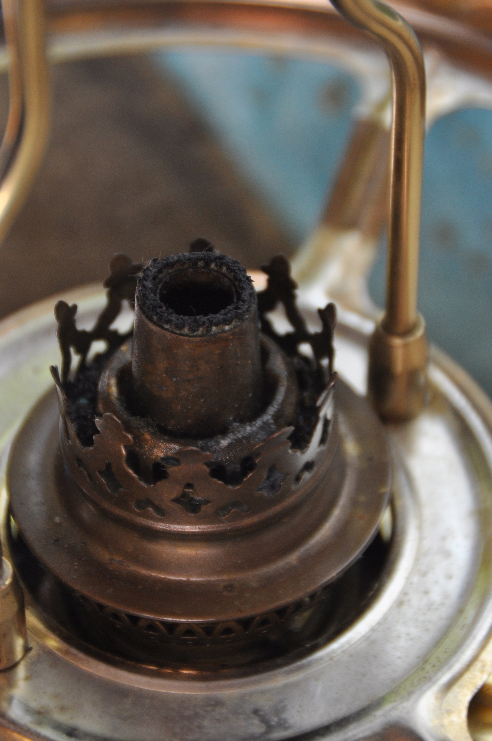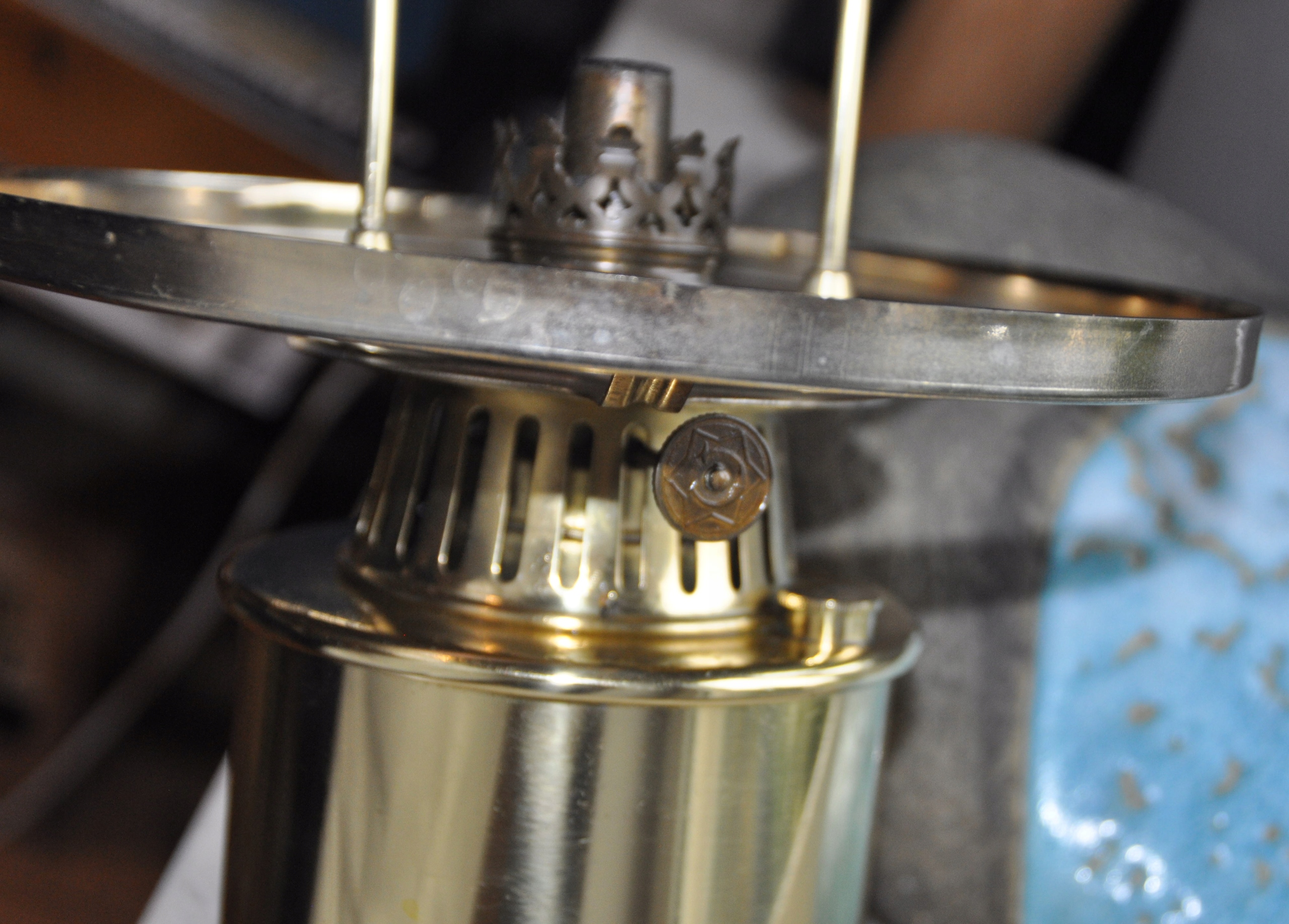 Состояние: хорошее - видно на фотографиях, ручка Бренера поворачивается с трудом, небольшой скол на стекле у нижнего края абажура - увеличено на последнем фото.