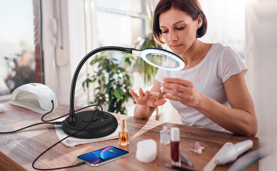 5-кратная лупа с подсветкой и основанием, складная конструкция со светодиодной увеличительной лампой для плотной работы. Светодиодная лампа имеет регулируемую интенсивность света. Дополнительно лампа имеет 2xUSB + 1x USB-C