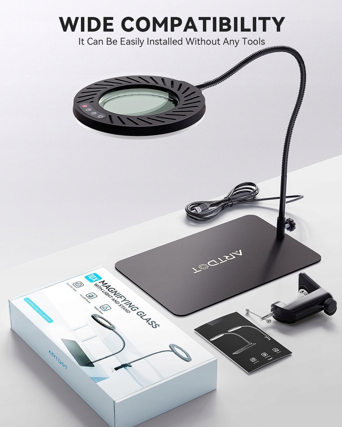 artdot 10 x Увеличение стекла со светом и подставкой, 144 светодиода, настольная лампа с 5 цветовыми температурами и 9 уровнями регулировки яркости, h1> - Увеличивающее стекло 10 x HD: настольная лампа имеет 10 раз увеличение, а объектив стекла HD с 144 светодиодами гарантирует яркость и презренность. Легкая область покрытия. Устойчивое потребление и царапины стекло с твердостью 6H обеспечивает лучшую стойкость к истиранию, что эффективно предотвращает царапину линз.