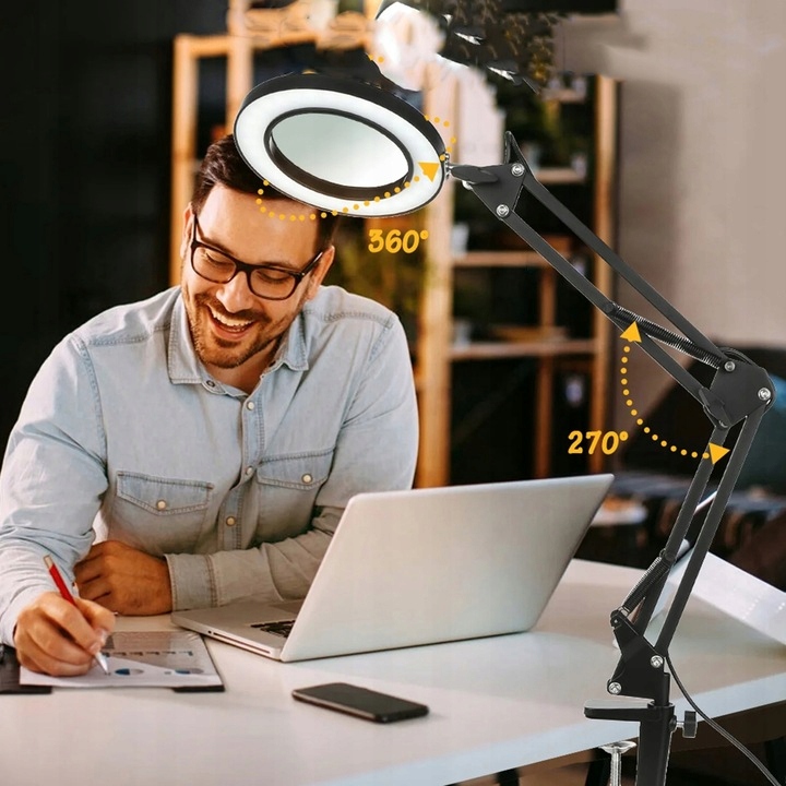 Стеклянную линзу можно регулировать вверх и вниз на 270° и поворачивать на 360°. Телескопическая длинная стрела обеспечивает большую гибкость. Рычаг можно удлинить до 50 см с помощью 3 ручек и 4 пружин. Регулируя ручки, вы можете удерживать светодиодный светильник в нужном положении, не двигаясь с легкостью, тем самым освобождая обе руки. Металлический зажим надежно фиксирует увеличительное стекло и предотвращает его падение. Подходит для письменных столов, верстаков, полок, столов и т. д.