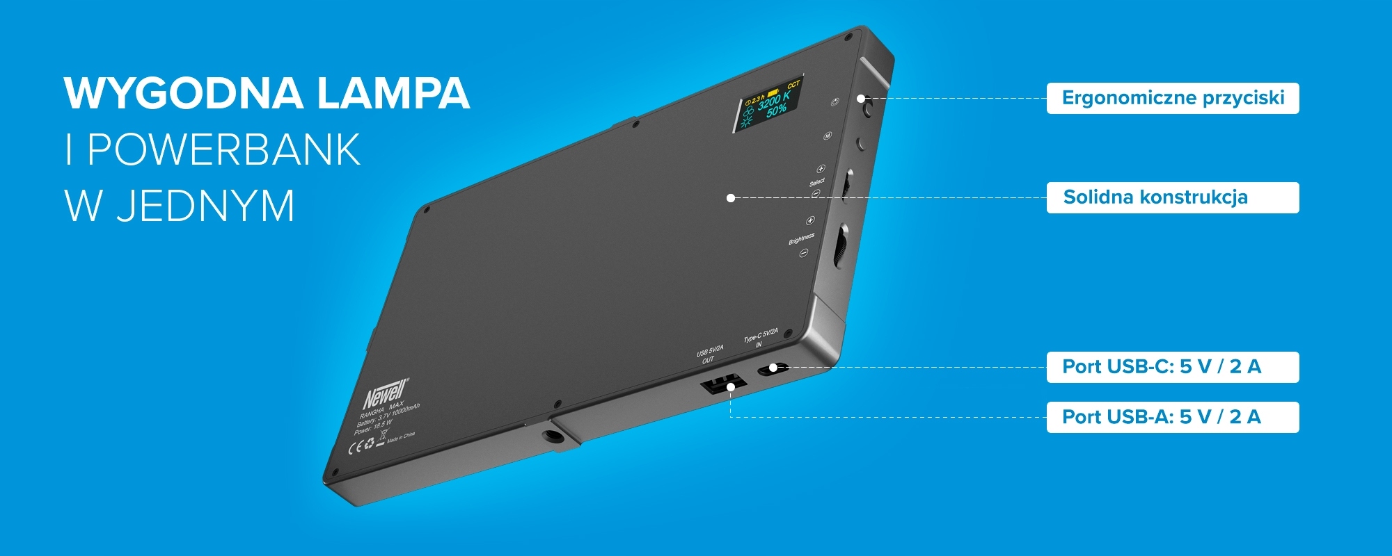 Newell RGB-W Rangha Max предлагает множество удобств, присущих более крупным моделям ламп. Эргономичные ручки и кнопки позволят вам удобно настроить яркость света в соответствии с вашими текущими потребностями. Не забыл производитель также о регулировке цветовой температуры (в диапазоне от 3200 К до 5600 К), которую вы сможете быстро настроить под существующие условия или конкретные потребности ваших кадров и снимков.