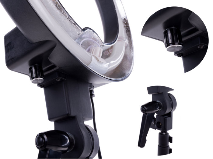 Кольцевая лампа постоянного света идеально подходит для фотосъемки небольших объектов и макросъемки. Это один из немногих снимков, который полностью лишен мерцания — он не вводит в заблуждение измеритель баланса белого камеры. Лампа обеспечивает длительную, безотказную работу и отличную цветопередачу на уровне Ra>90. Лампа также идеальна в качестве лампы для макияжа и портрета. Дополнительным преимуществом является диммер, благодаря которому мы можем плавно регулировать мощность света.