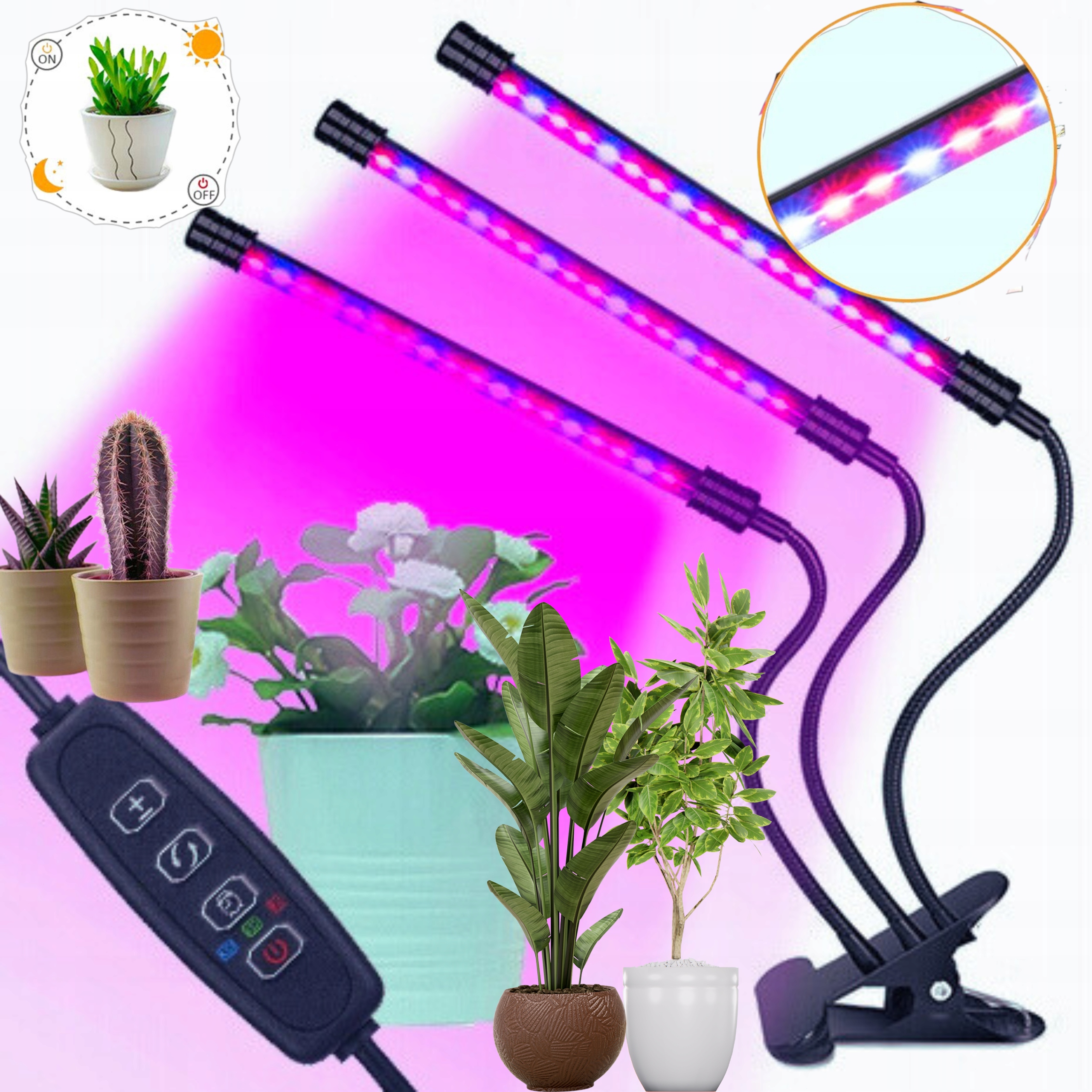 На шнуре питания лампы есть пульт дистанционного управления для управления его функциями. Благодаря этому мы включаем и выключаем устройство, изменяем интенсивность освещения (+/-) или программируем время освещения устройства. Функция таймера чрезвычайно полезна, потому что с его помощью мы можем запрограммировать время освещения лампы и, следовательно, подходящее время воздействия растений. Даже в нашем отсутствие!