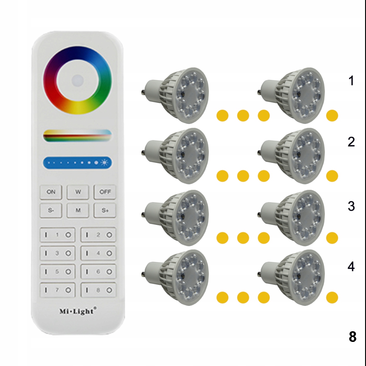 SMART LED RGB+CCT WiFi GU10 230V MiLight FUT103 лампочка с возможностью отображения любого цвета (доступно 16 миллионов цветов из палитры RGB), а также любого белого света. в диапазоне 2700-6500 К, мощностью 4Вт с держателем GU10, управляемым радиоволнами 2,4 ГГц, с 8-зонным пультом MiLight FUT089.