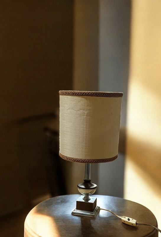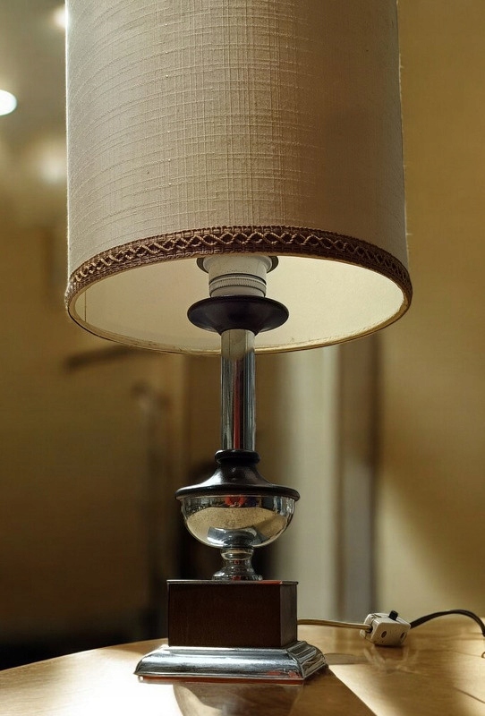Светильник использован - ножка изготовлена из металла и дерева. Состояние лампы хорошее; абажур тоже в хорошем состоянии.