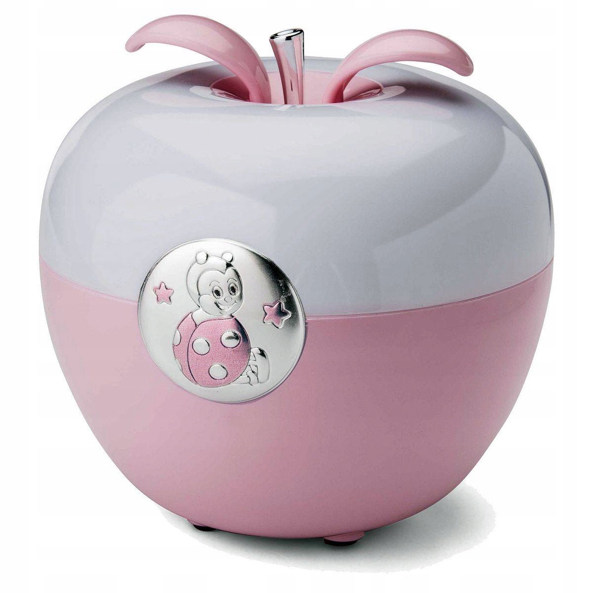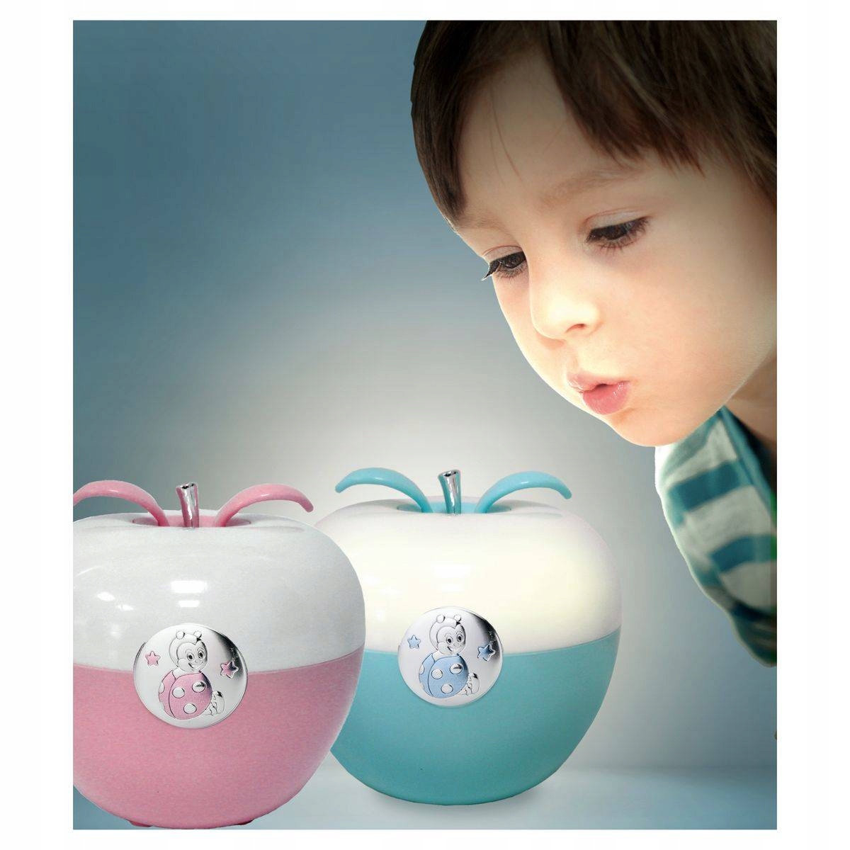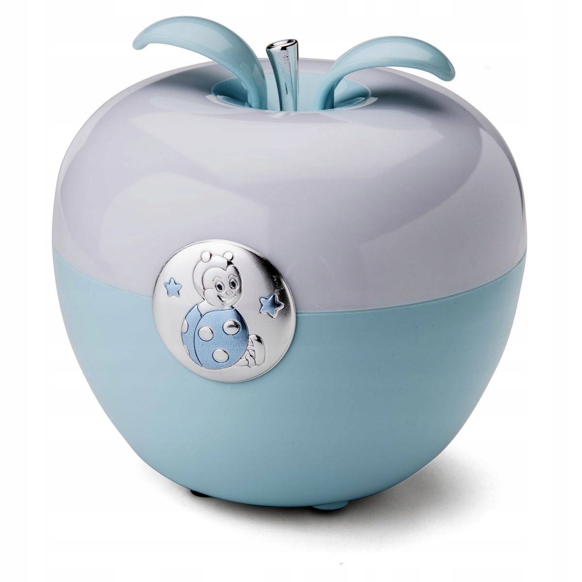 Ночник в форме яблока с круглой эмблемой с изображением Божьей коровки.