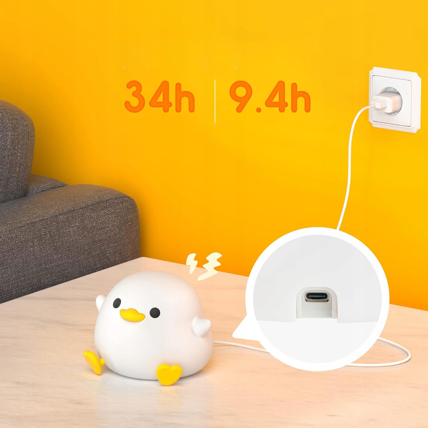Lampka nocna Duck z dwoma regulowanymi poziomami jasności. Funkcja synchronizacji czasu