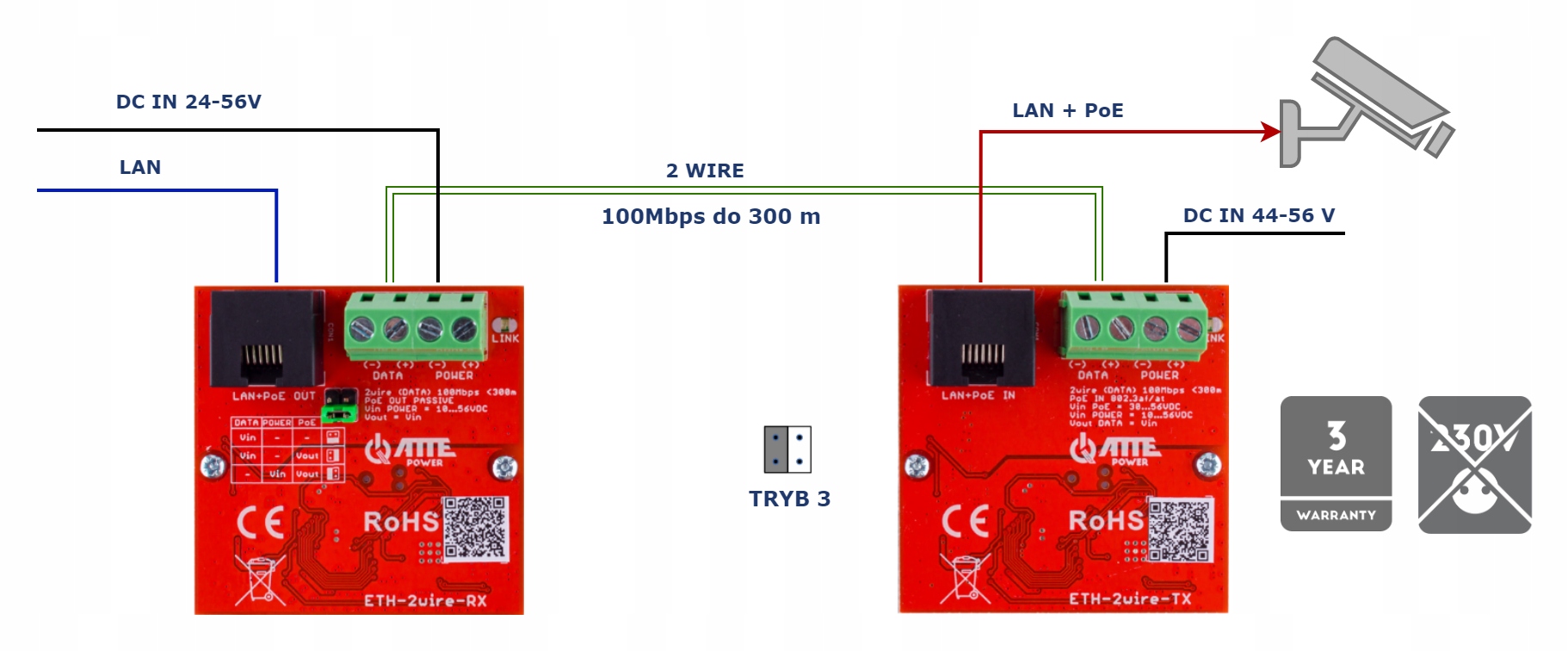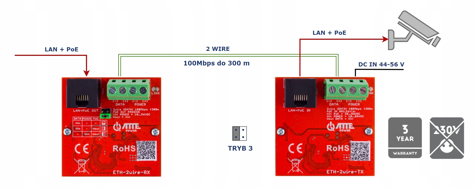 Камера питается по PoE через канал 2WIRE. В такой конфигурации следует обратить внимание на падение напряжения на дорожке 2WIRE. Бюджет PoE, подаваемый на камеру, зависит от диаметра проводов используемого кабеля. Передатчик и приемник ETH-2WIRE будут корректно работать в диапазоне напряжения 24–56 В, однако для камеры, подключенной к приемнику, обычно требуется источник питания PoE 44–56 В. Эти факторы следует учитывать при выборе напряжения питания передатчика ETH10-2WIRE-TX, в случае систем с резервное питание.