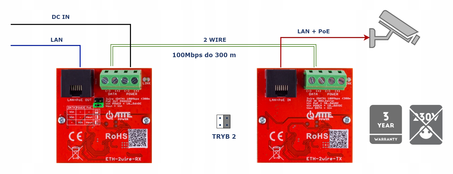 Устройства допускают установку камер или других IP PoE-устройств в местах, где замена существующей проводки невозможна или нерентабельна. Модуль ETH-2wire-TX питается от любого коммутатора PoE (порт RJ45), а затем по 2 проводам, обеспечивая двустороннюю сетевую связь и питание модуля ETH-2wire-RX.