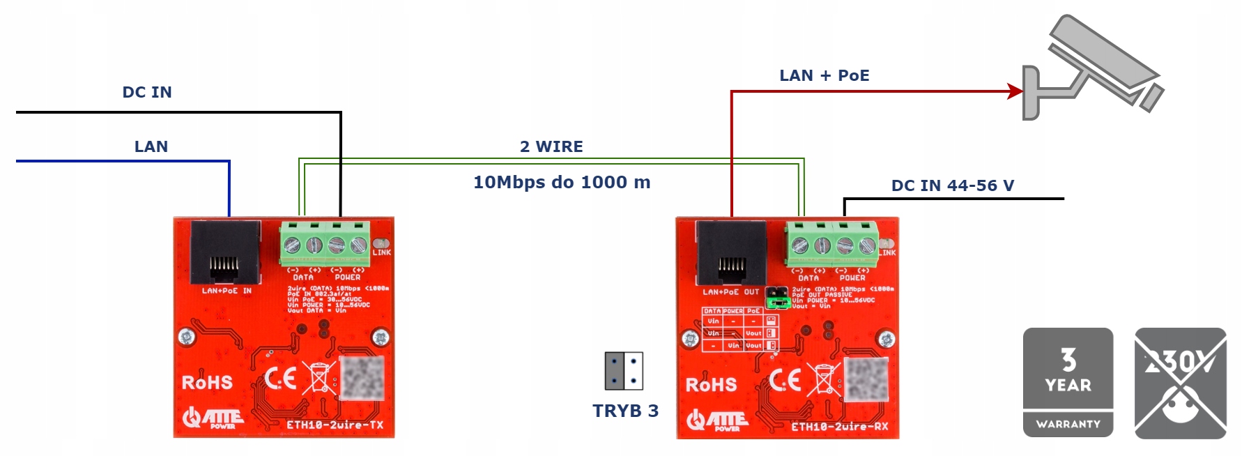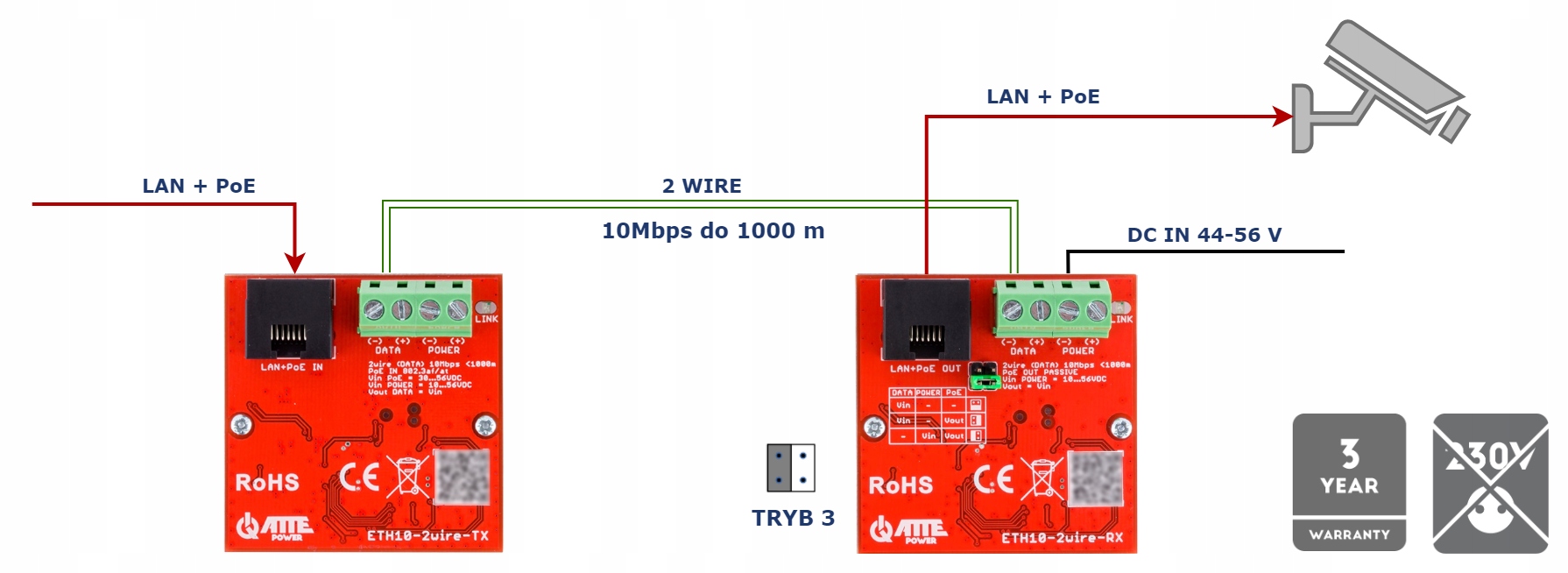 Модуль ETH10-2wire-TX питается от любого коммутатора PoE (порт RJ45), а затем по 2 проводам обеспечивает двустороннюю сетевую связь и питание модуля ETH10-2wire-RX с камерой PoE. Опционально устройства могут питаться от винтовых разъемов POWER. Максимальная длина кабелей в двухпроводной трассе — 1000 м.