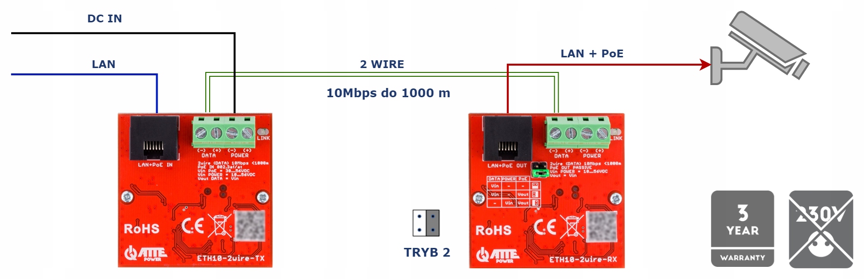 Набор для передачи LAN + PoE с использованием двух кабелей ATTE ETH10-2wire-SET — 10 Мбит/с, до 1000 м