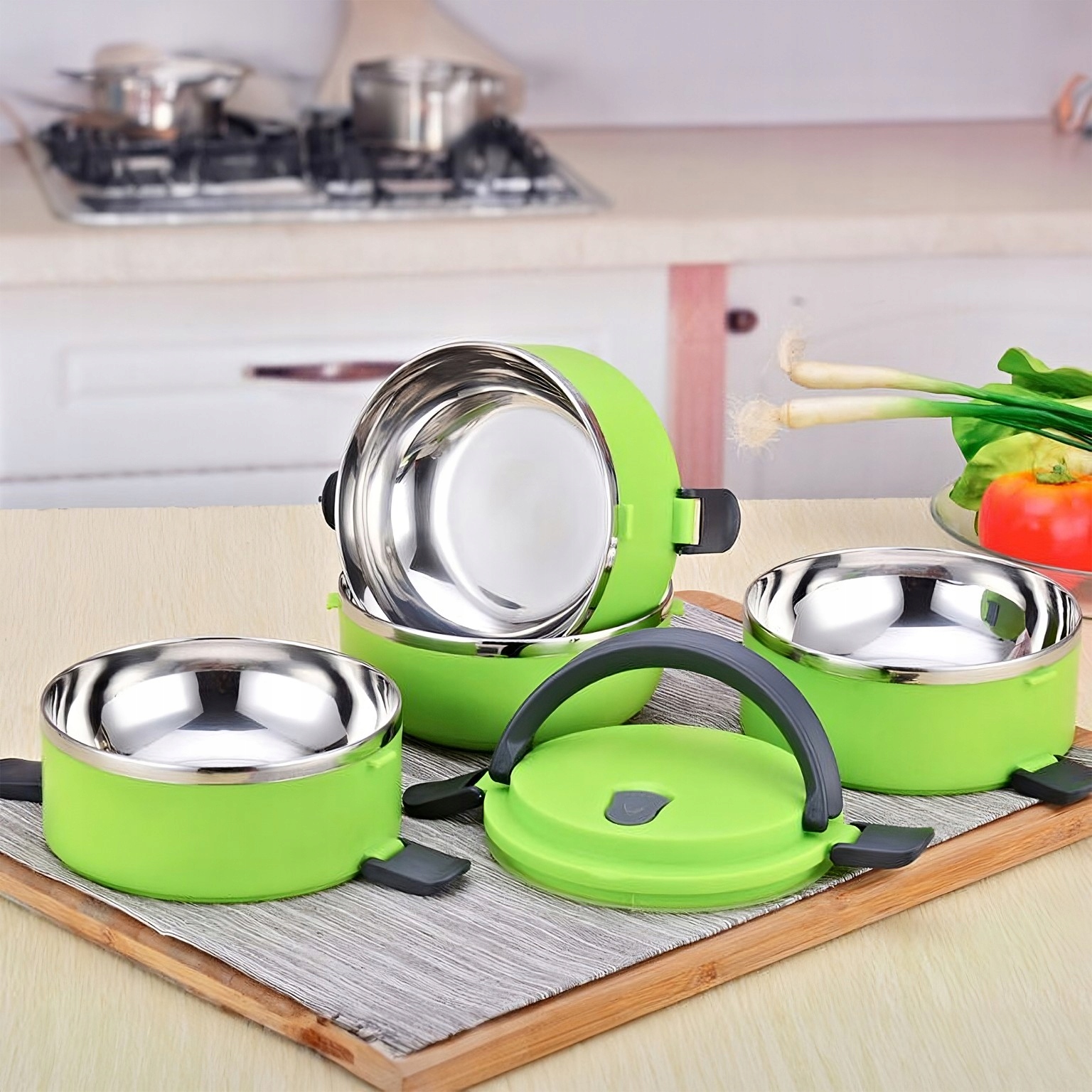 Благодаря изоляционным контейнерам можно брать с собой разные блюда, которые не только не перепутаются, но и благодаря соответствующей изоляции , сохранит их температуру и запах.