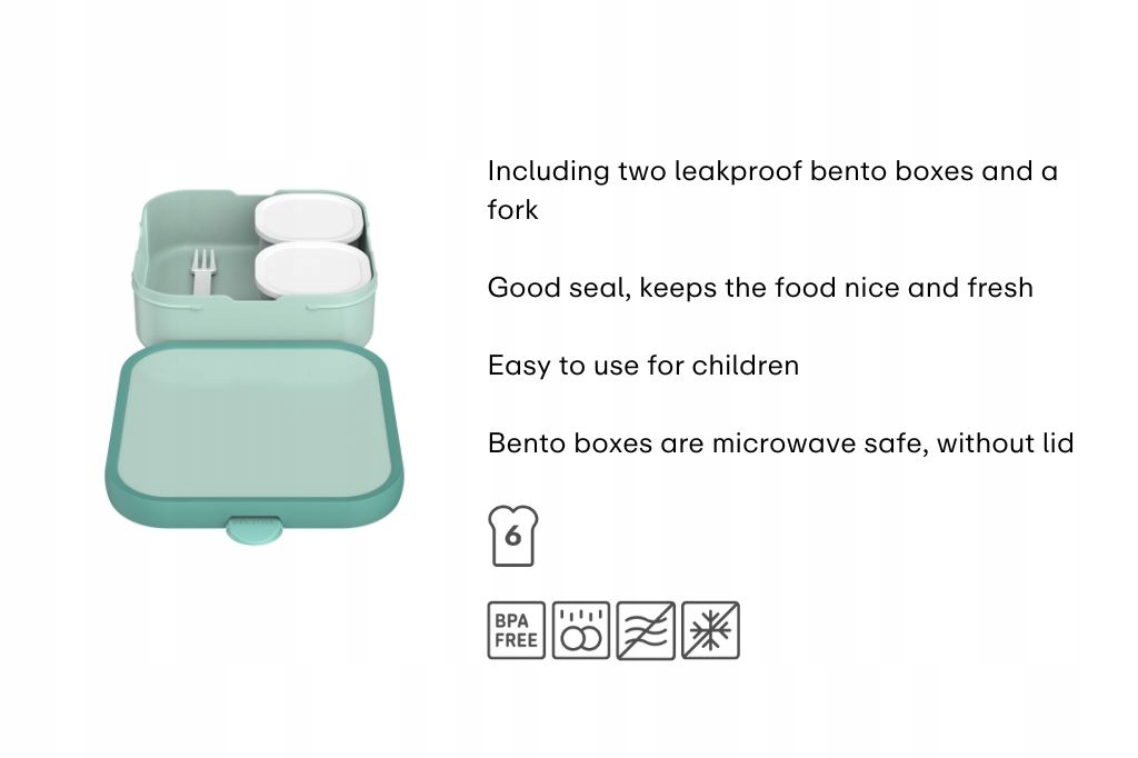 Ланчбокс вмещает до 4 бутербродов и дополнительно имеет два съемных контейнера (по 200 мл каждый), в которых можно отделить свежие фрукты, овощи или другие закуски от основного блюда. Дополнительная практичная вилка позволяет принимать пищу без необходимости искать дополнительные аксессуары.