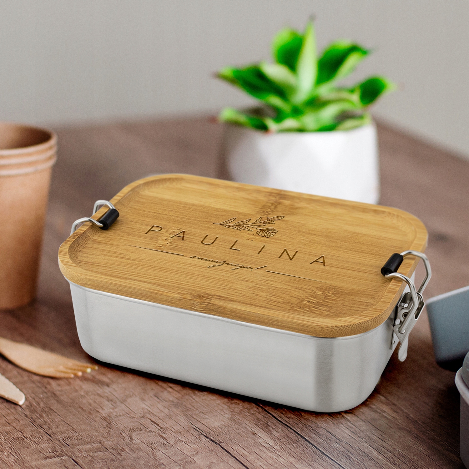 Металлический ланчбокс с бамбуковой крышкой – это сочетание хорошего качества изготовления и эстетичного внешнего вида. Ажурная гравировка с именем будет отлично смотреться на фотографиях и станет прекрасным подарком начинающему инфлюенсеру.