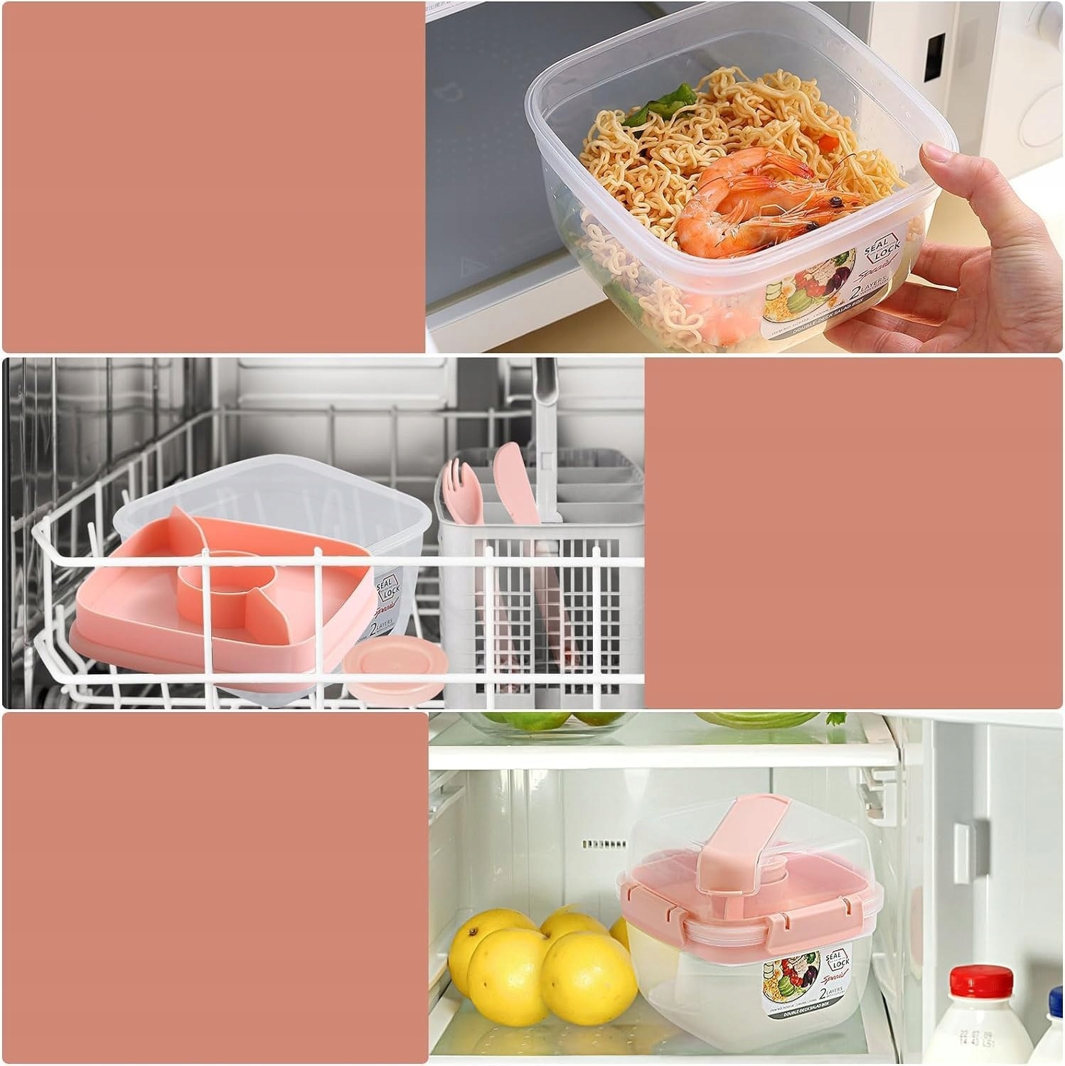 Герметичный контейнер для бенто: Когда вы закрываете контейнер для салата на вынос, перекладины с 4 сторон издают звук щелчка, поэтому вы можете быть уверены, что он закрыт и герметичен. Силиконовое уплотнительное кольцо, встроенное в крышку, предотвращает протекание продуктов и сохраняет их свежими. Вы можете положить его в рюкзак или сумку. Хранение жидкостей не рекомендуется.