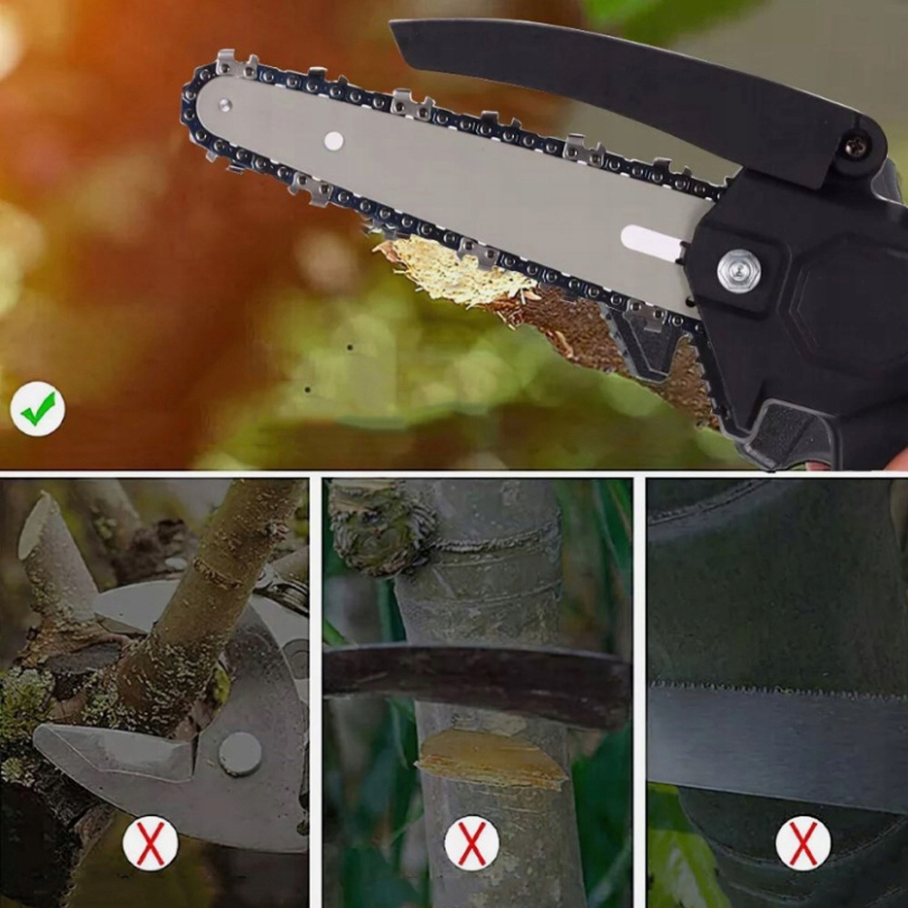 Улучшенная мини -цепная пила использует острую высокую цепочку твердости, чтобы обеспечить более плавное разрешение. Скорость цепи может достигать 5 м/с, что позволяет легко разрезать более крупные деревья за 8 секунд. Потребление энергии, низкий уровень шума и эффективная резка