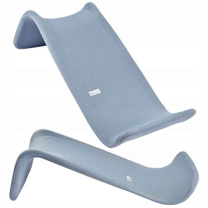 В нежных серо-голубых тонах. Наклонное положение отвечает потребностям малышей - обеспечивает комфорт, свободу движений и безопасность во время купания.
