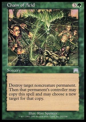 Уничтожьте целевой перманент, не являющийся существом. Затем контроллер этого перманента может скопировать это заклинание и выбрать новую цель для этой копии.