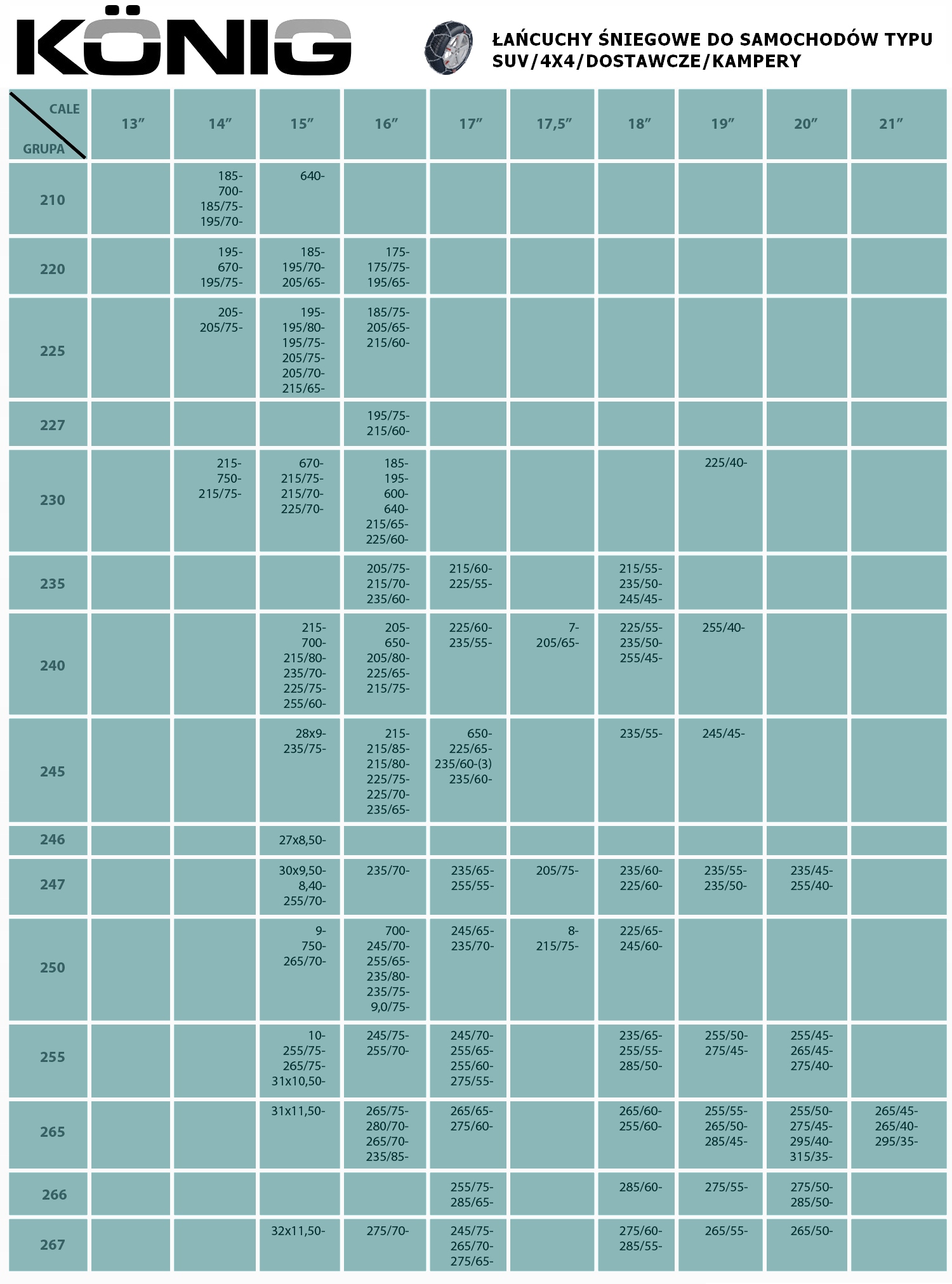 Прочитайте размер шины и проверьте в таблице ниже, какая группа цепей ей подходит (пример: фото ниже 225/40-18) - найдите цепь на наших аукционах Allegro, введя ее название и размерную группу, например CB12. 97