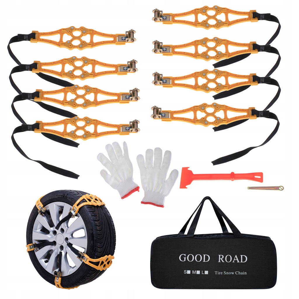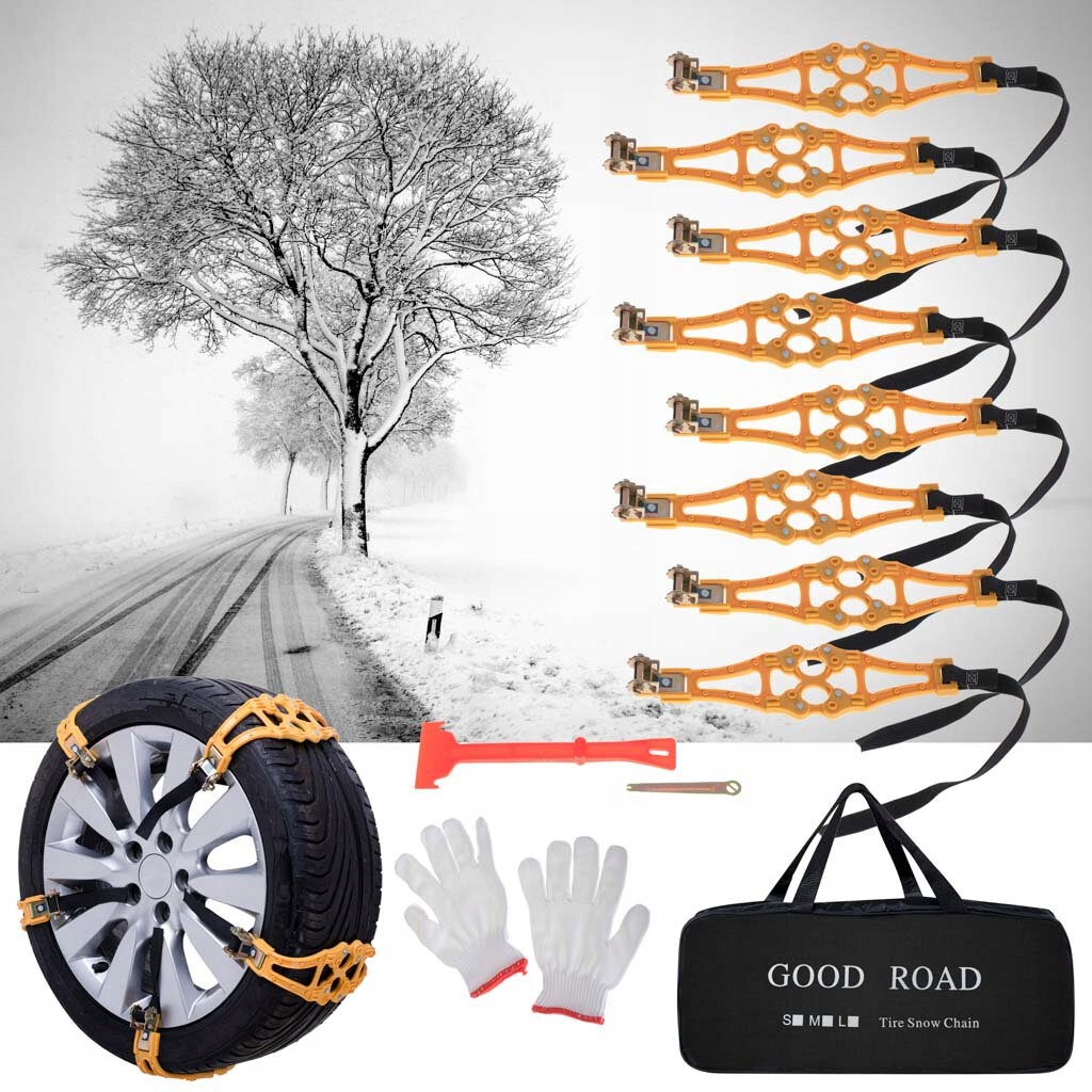 Практические цепи противоскольжения, которые обеспечат безопасность во время движения и помогут преодолеть опасные участки маршрута. Количество: 8 шт. В комплект также входят перчатки и скребок для окон. Материал: силикон. Окружность цепочки: около 67 см.