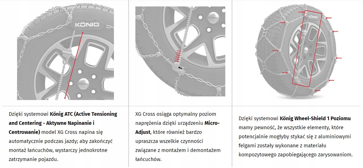 После установки цепи противоскольжения на колесо нет необходимости останавливать автомобиль для повторного натяжения изделия. Система König ATC позволяет полностью автоматически добиться оптимального натяжения цепи и центрирования шины во время движения.
