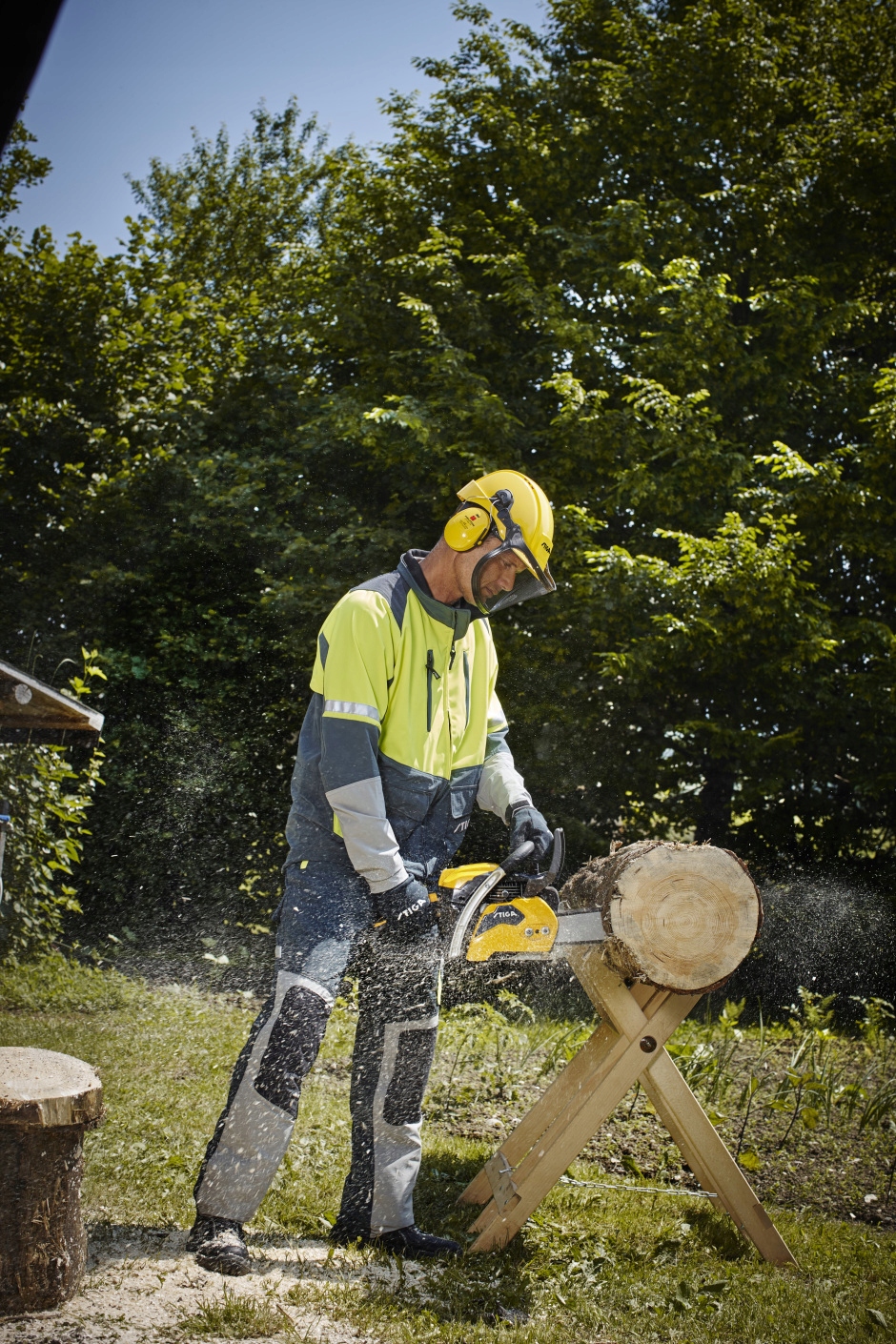 - Оснащена двигатель с искровым зажиганием объемом 52 см³ (2,3 кВт) и магниевой крышкой двигателя, обеспечивающей долговечность и быстрое охлаждение.