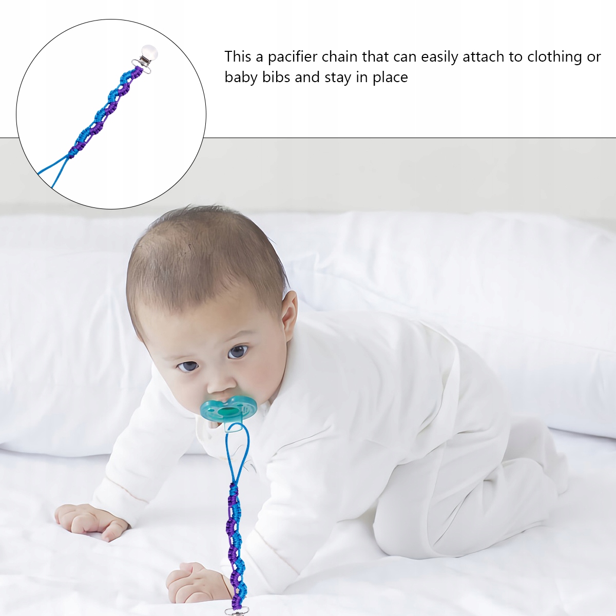 Эту цепочку для пустышки можно легко прикрепить к одежде или нагруднику и удерживать на месте. Вы можете использовать цепочку для соски для подключения всех ваших любимых пустышек, прорезывателей, пустышек, игрушек и других детских аксессуаров. Следите, чтобы соска не потерялась и не упала на землю.