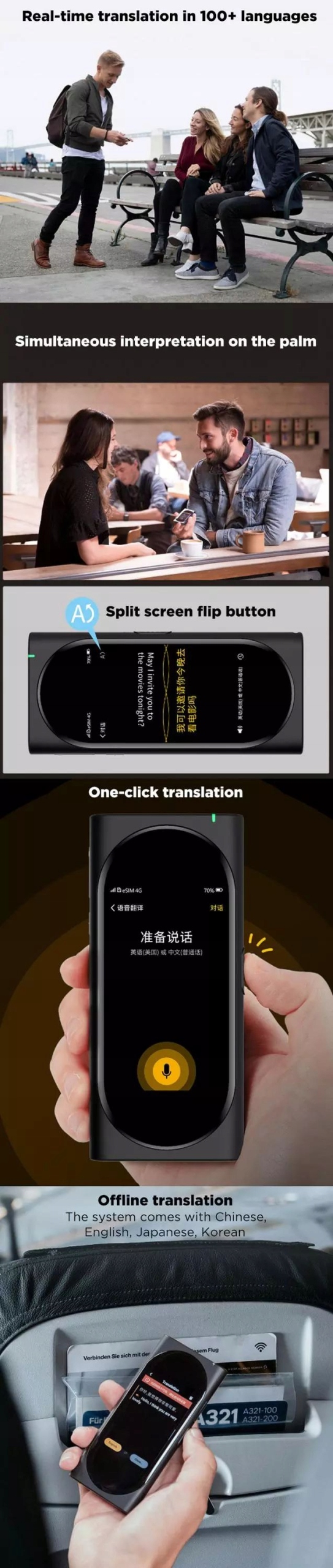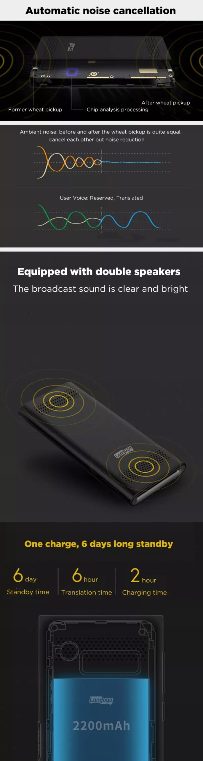 Благодаря использованию технологии потокового перевода перевод происходит до 4 раз быстрее, что делает Langogo идеальным устройством для перевода в реальном времени и отличным способом ведения двуязычного разговора.