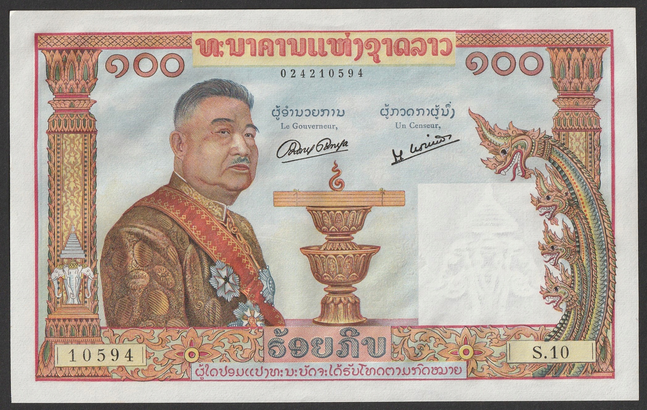 Laos 100 kip 1957 - S.10 - król Sisavang Vong - stan bankowy UNC