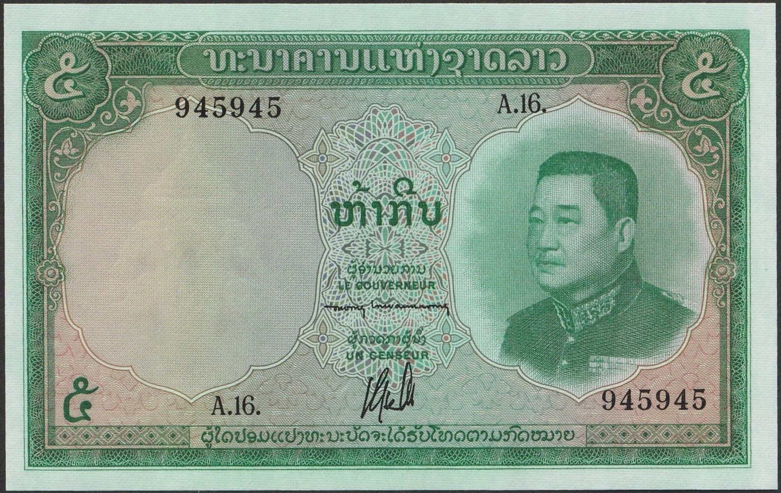 Laos 5 kip 1962 - król Sisavang Vong - stan bankowy UNC