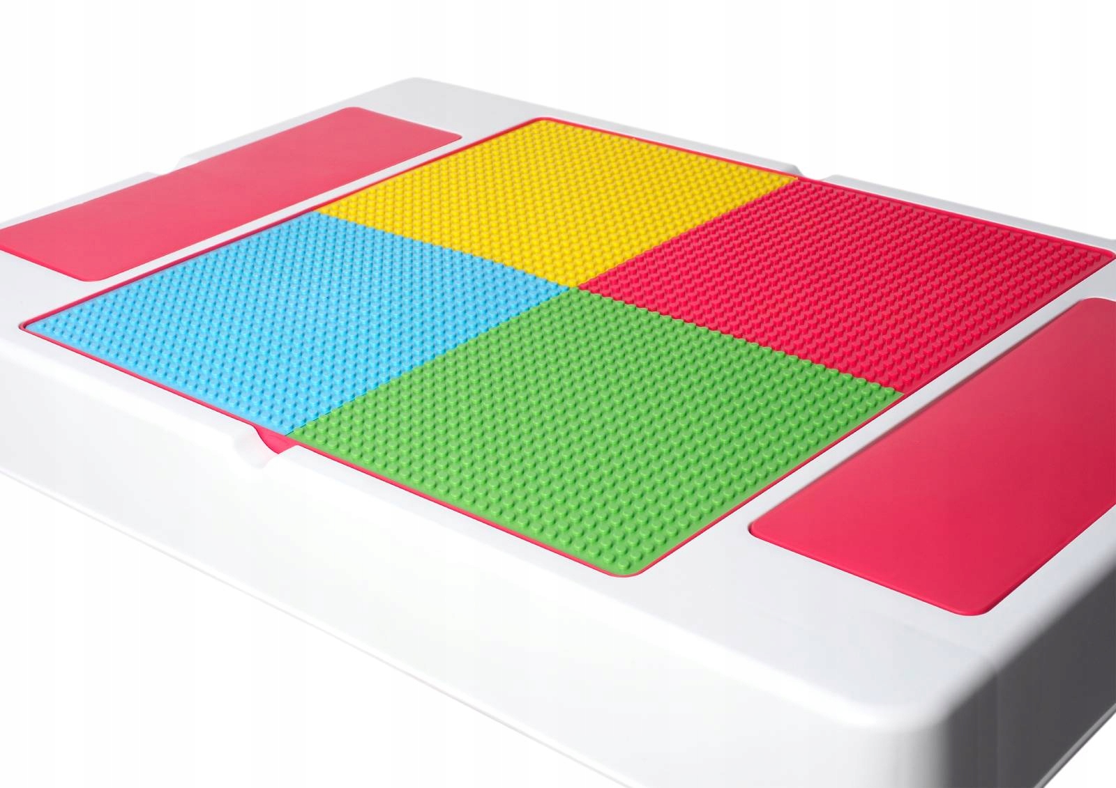 - Покрытие столешницы большего размера двустороннее: с одной стороны оно гладкое – для рисования, письма и раскрашивания. ; с фактурой с другой стороны - становится доской, совместимой с кубиками популярного бренда (блоки не входят в комплект столешницы)