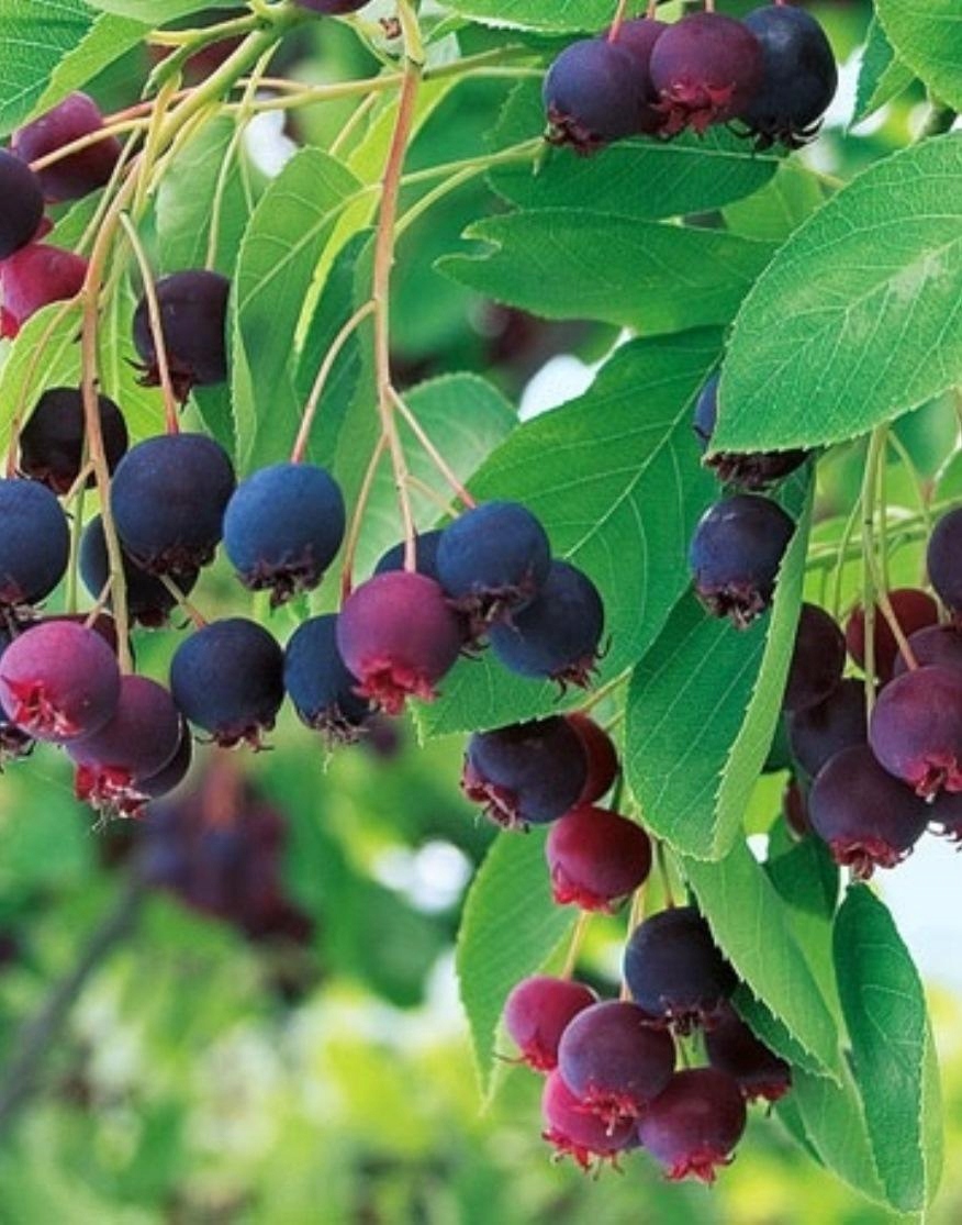 - Плоды: похожи на чернику, чрезвычайно декоративны, от при созревании от пурпурно-красного до почти черного. Плоды созревают в июле и августе. Они очень вкусные, сочные и сладкие – очень нравятся детям. Плоды канадской ирги содержат железо, кальций и калий. В них гораздо больше этих элементов, чем в других фруктах.