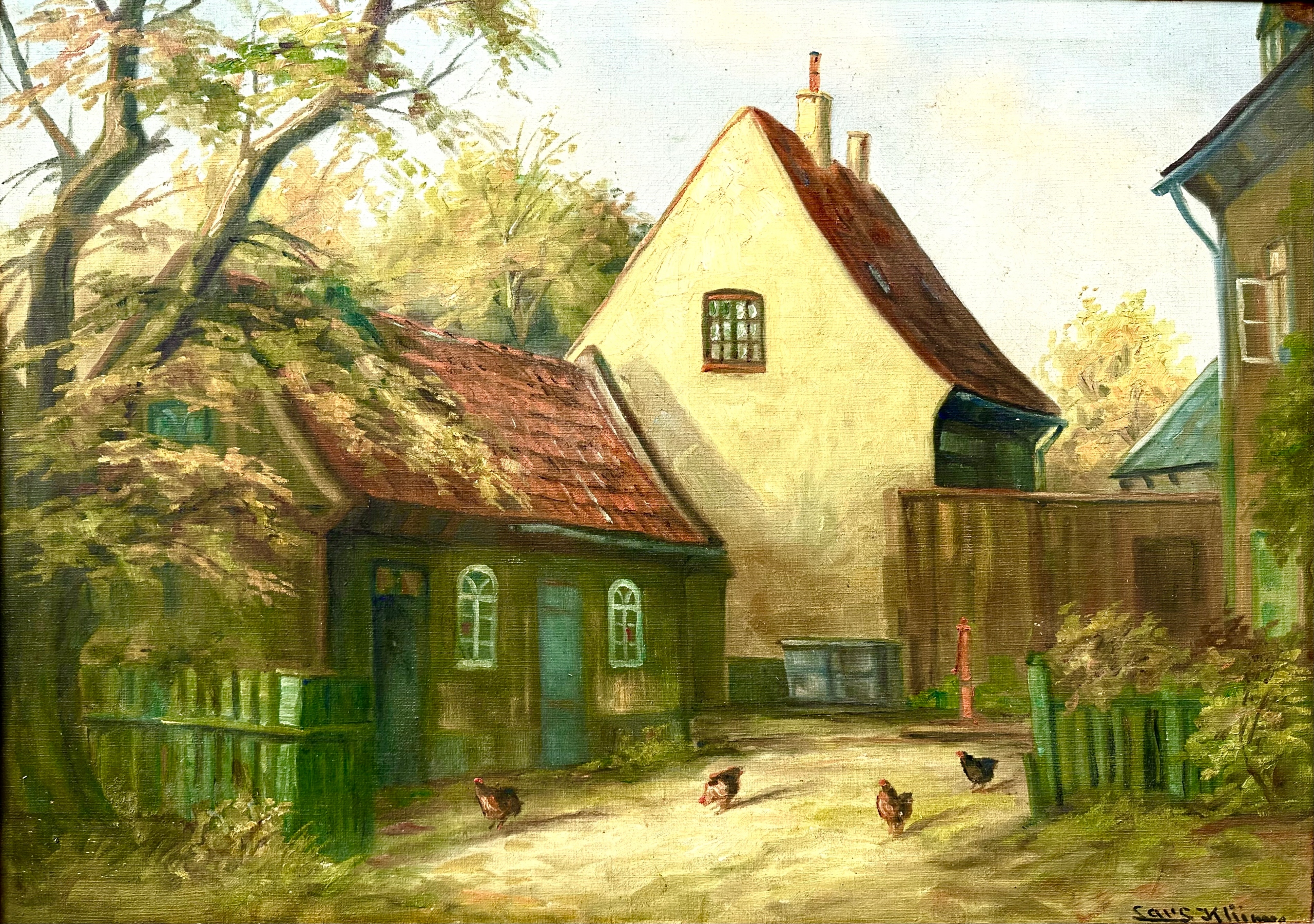 ЛАРС КЛІМ (1881-1942) СТАРІ СІЛЬСЬКІ ХАТИНИ СЕРЕД ДЕРЕВ СТАРА ЦІННА КАРТИНА