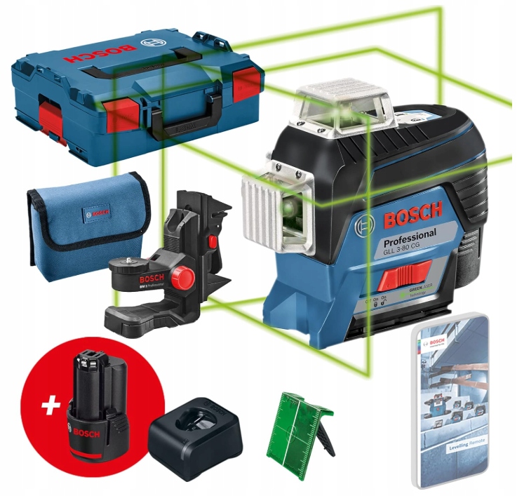 в четыре раза лучшую видимость благодаря с и зелеными лазерными линиями - Bosch GLL 3-80 CG-лазер был оснащен зелеными лазерными линиями, которые позволяют вам еще больше выделить отображаемые лазерные линии. Традиционные красные лазерные линии гораздо менее заметны в местах с высоким солнечным светом. Новая модель CG GLL 3-80 значительно увеличивает комфорт работы с использованием лазерных уровней.