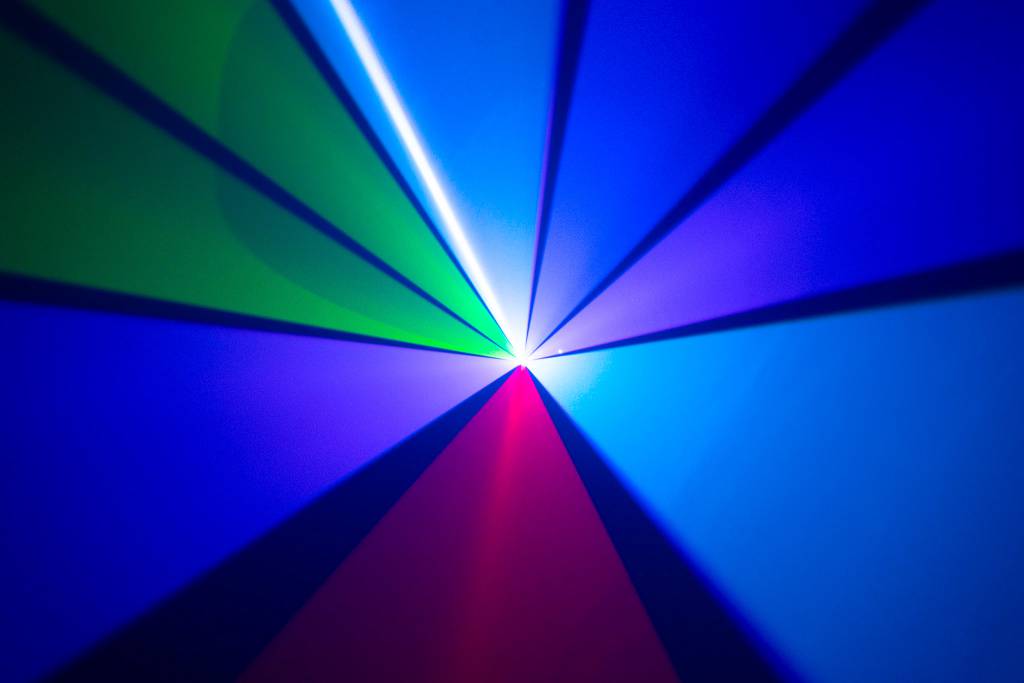 Модуль красного диода с длиной волны 650 нм, зеленый лазерный модуль DPSS с длиной волны 532 нм и модулем королевского синего лазерного модуля с длиной волны 445 нм обеспечивает красивые цвета и светлые лучи. Эти пучки имеют диаметр около 3 мм и дивергенция пакета из 2 файлов. Лазерная система имеет 15 кс с с.п. 8 ° для создания различных конструкций. Эффекты могут контролироваться DMX. Режим звука в свет и автономный режим также доступны. В режиме звука в свете чувствительность интегрированного микрофона может быть отрегулирована.