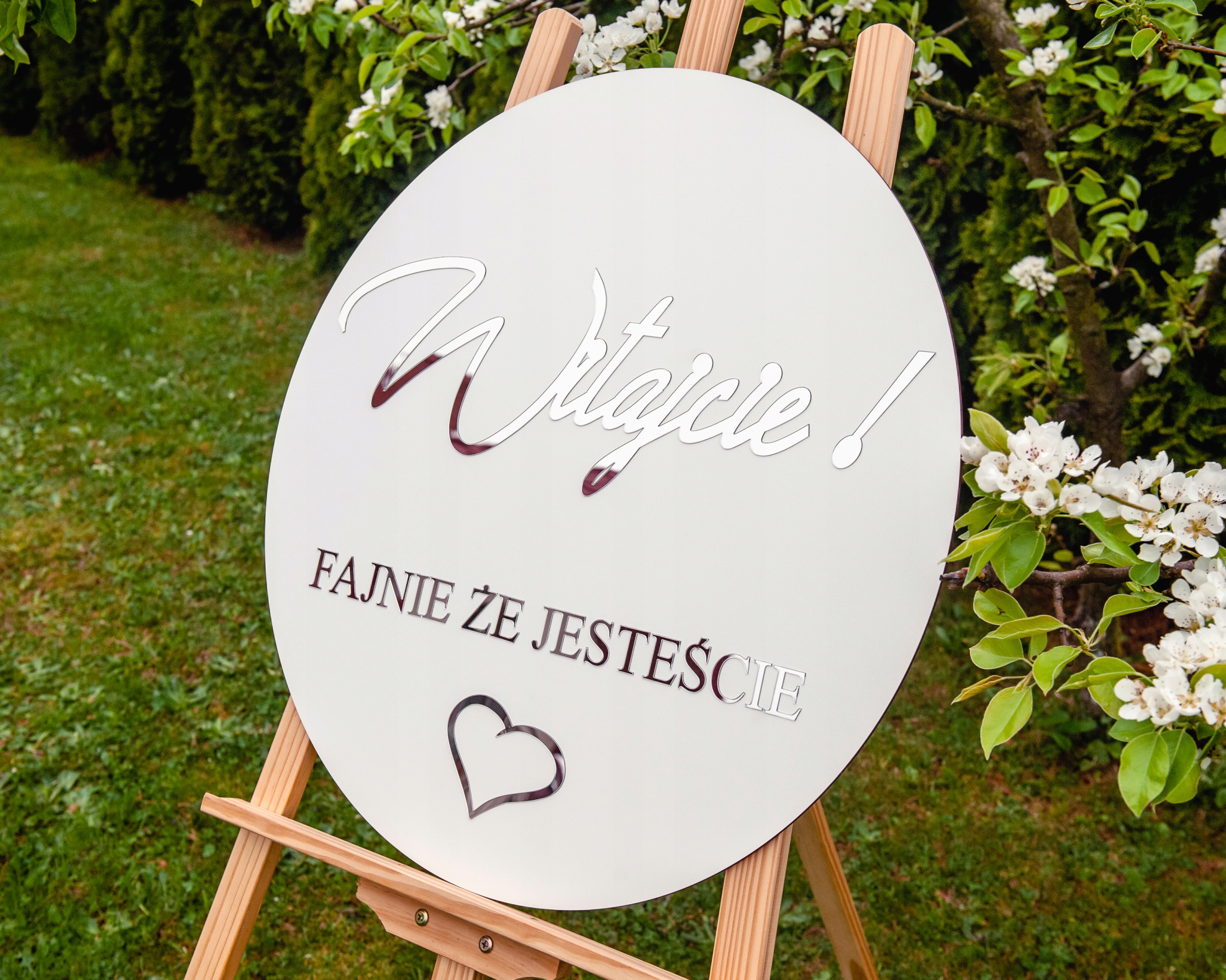 Красивое украшение, приветствуя гостей перед домом, а также перед свадебным залом. Субтитры, изготовленные с использованием метода лазерной резки из серебряного зеркала и приклеены к белым MDF.