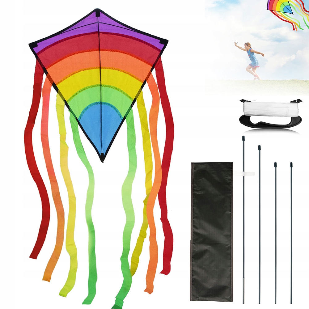 - 🌈 Rainbow Kite размером 73 x 65 см с 8 соответствующими разноцветными хвостами с длиной 105 см, с 80 -метровым кабелем змея. Набор воздушных змеев, легко складываться, идеально подходит для начинающих.
