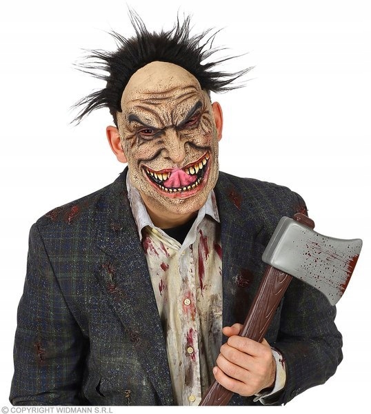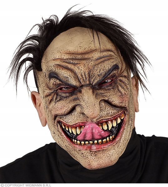 представляет ужасное, искаженное лицо с прикрепленными черными волосами.