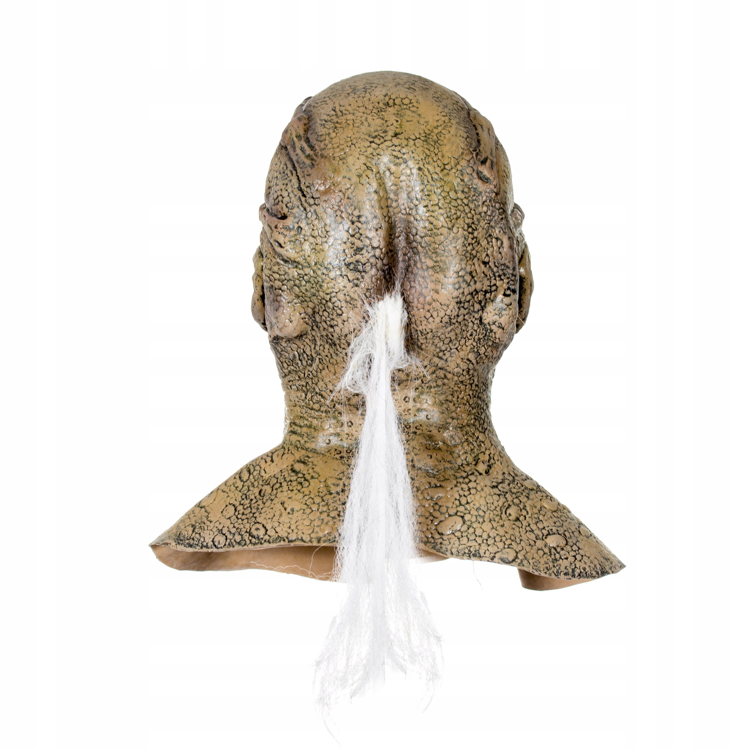 Маска закрывает всю голову и часть шеи. У персонажа характерное лицо, покрытое шрамами. Дополнительно сзади была прикреплена прядь седых волос.