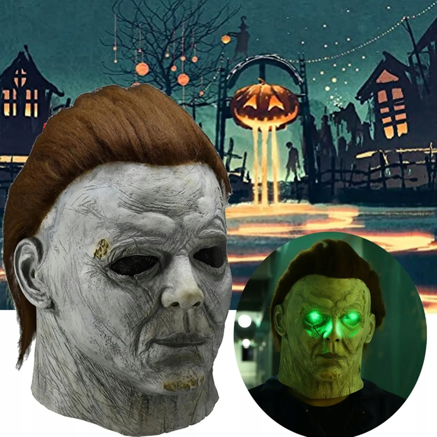 - Страшная светодиодная маска Майкла Майерса поставляется с париком из альпаки для создания реалистичного эффекта.