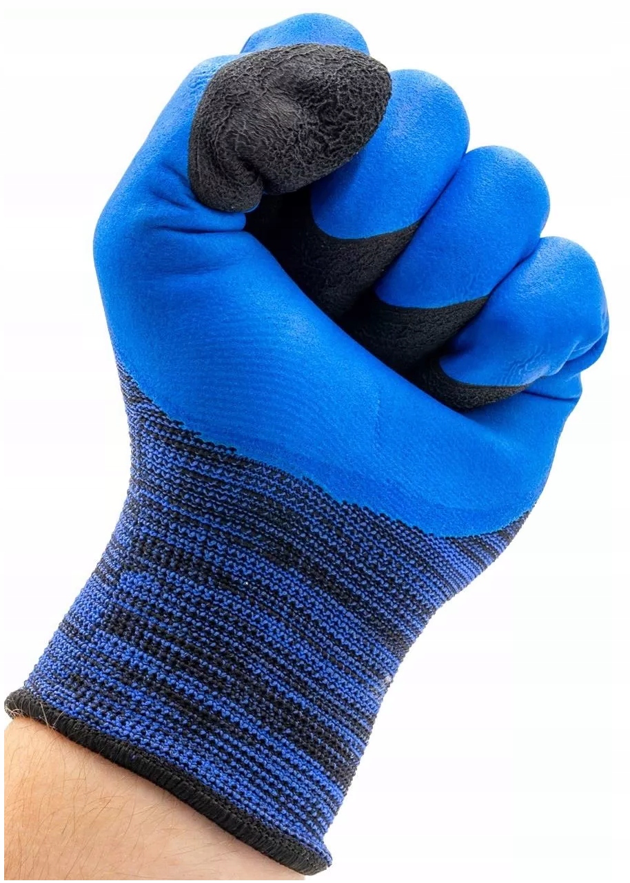 - Перчатки изготовлены из бесшовного синего полиэстера, покрытого гладким сине-черным латексом.
