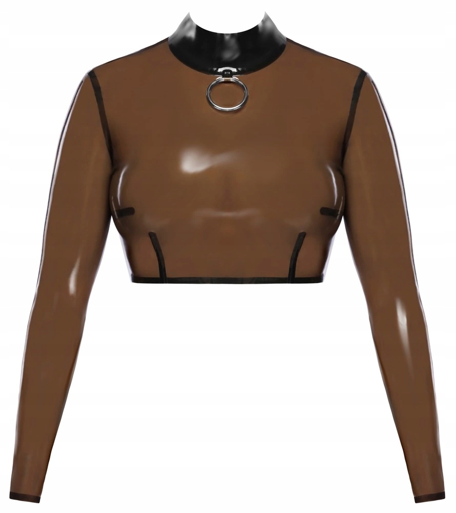 Характеристики продукта: Модель: Футболка из латекса с длинными рукавами и воротником стойкой. Обнаженный низ (без живота) Прозрачный цвет: дымчатый черный Материал: 100% натуральный латекс (клееный). Металлическое декоративное кольцо спереди. Длинная молния сзади Размер: М EAN-код: 4024144470693